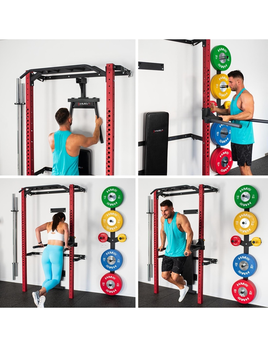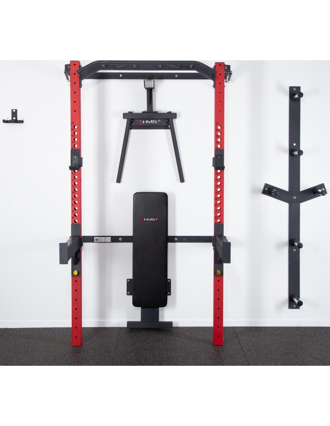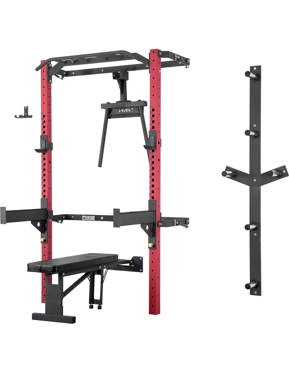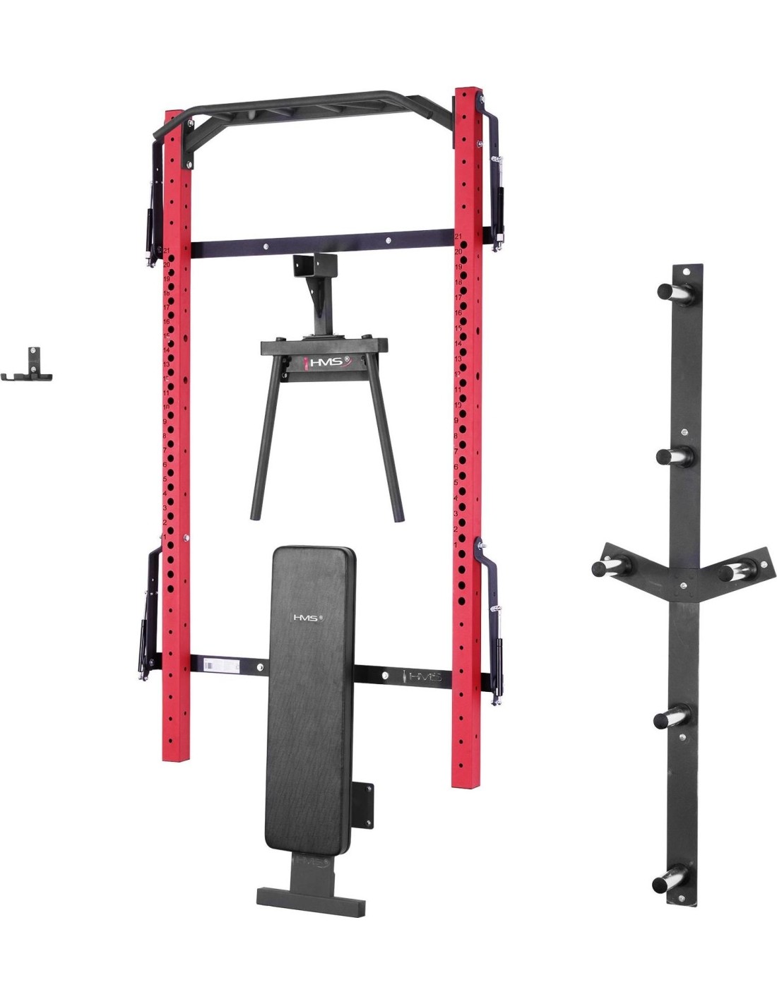 The KLT22 folding power rack from HMS has been designed to hit current market trends and meet the expectations of the most demanding customers. The cage in this variant is sold with additional equipment. In addition to a pull-up bar, barbell hooks and safety supports, you will find a folding flat bench, a handrail for dips, a wall-mounted weight rack and a bars holder. Such a set will expand your training range and provide new storage options for your equipment.