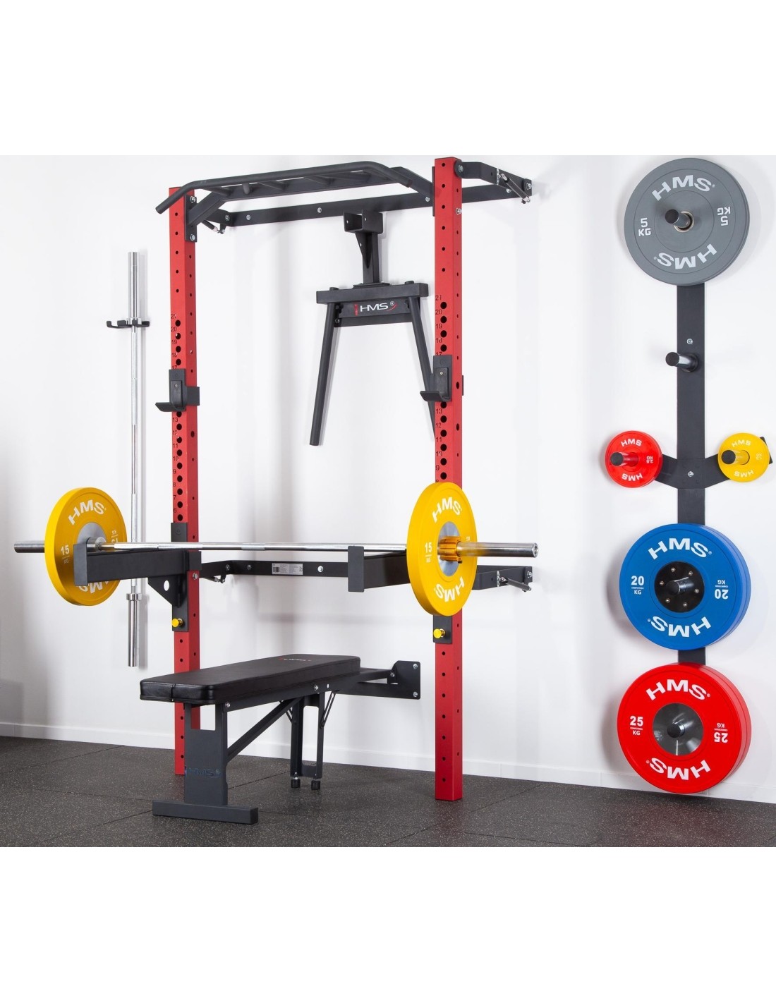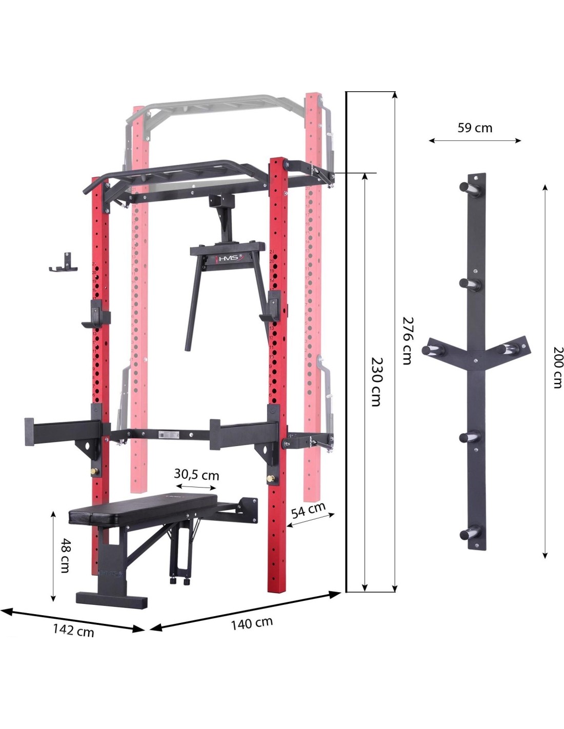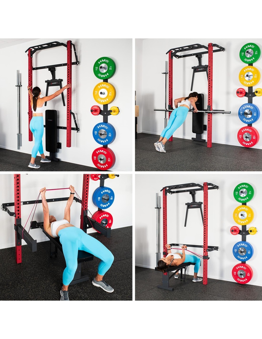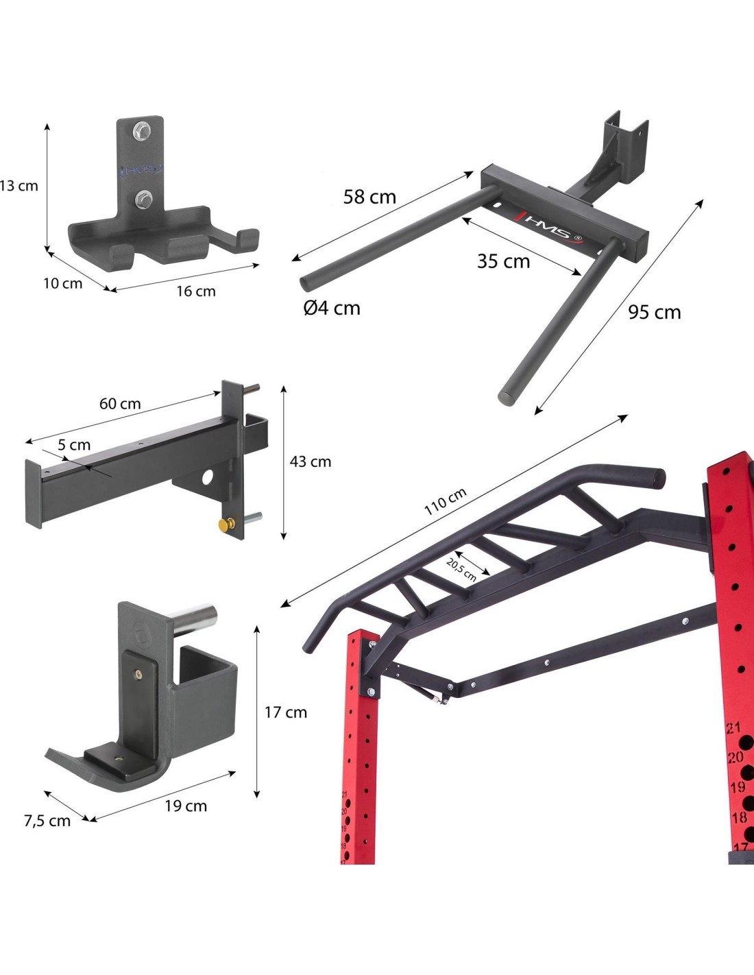 The KLT22 folding power rack from HMS has been designed to hit current market trends and meet the expectations of the most demanding customers. The cage in this variant is sold with additional equipment. In addition to a pull-up bar, barbell hooks and safety supports, you will find a folding flat bench, a handrail for dips, a wall-mounted weight rack and a bars holder. Such a set will expand your training range and provide new storage options for your equipment.