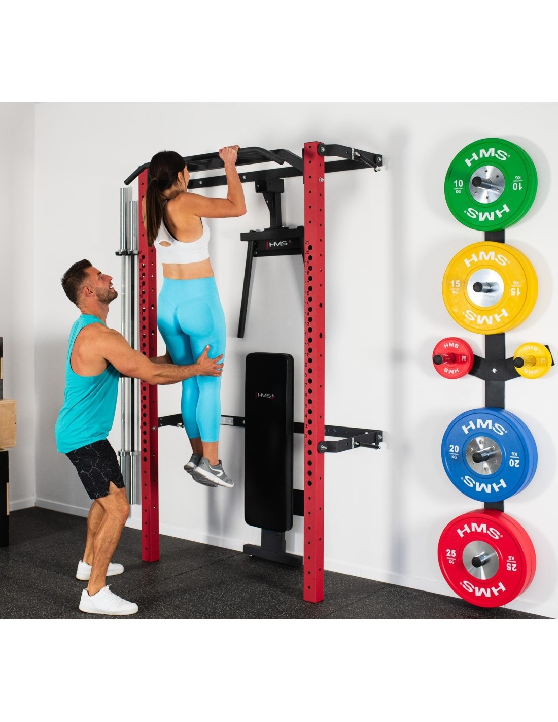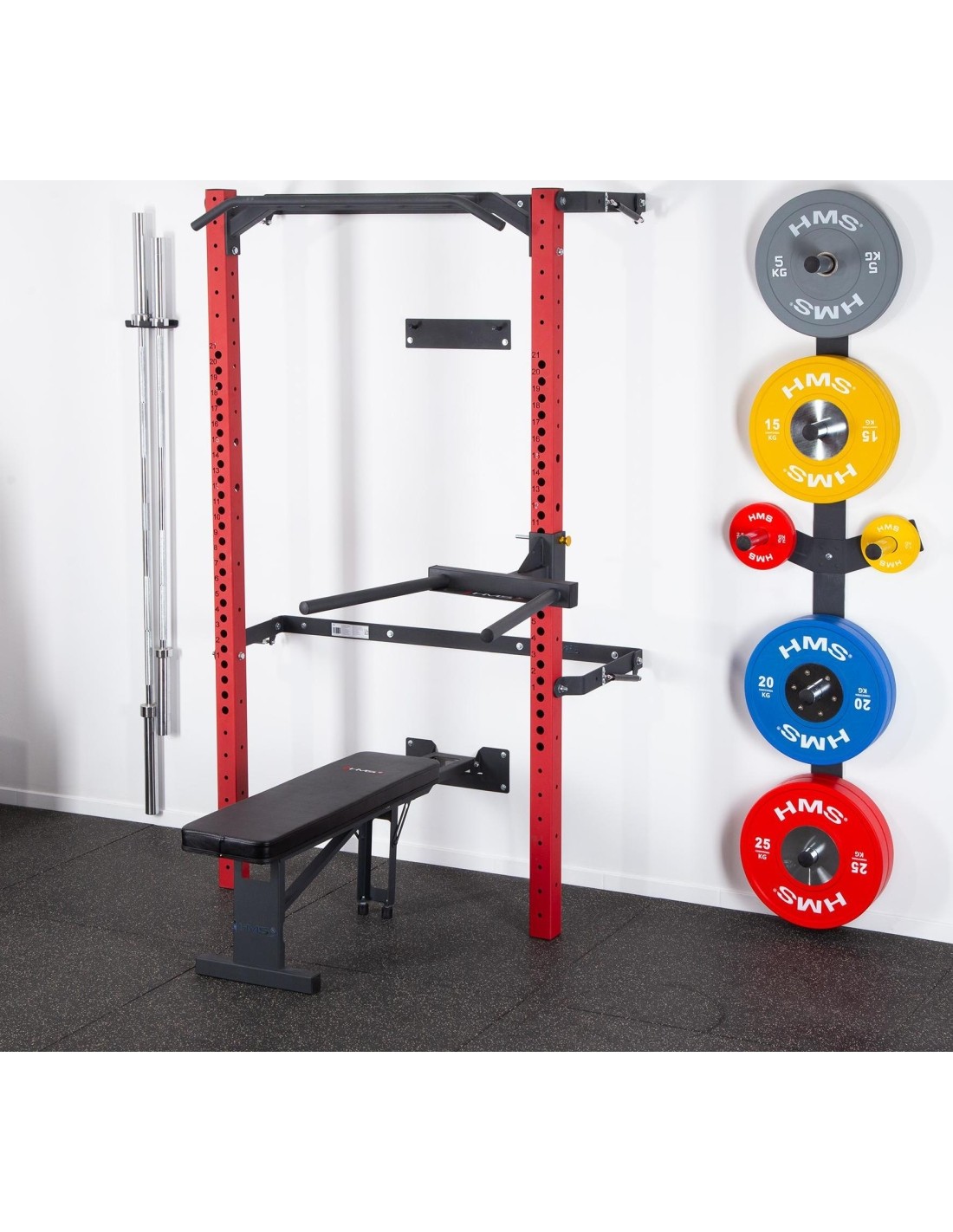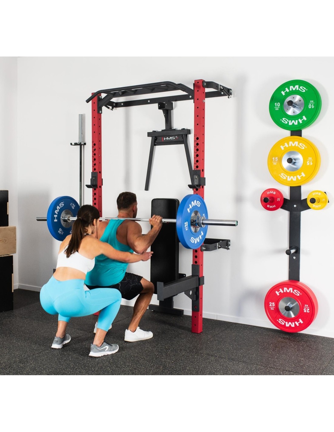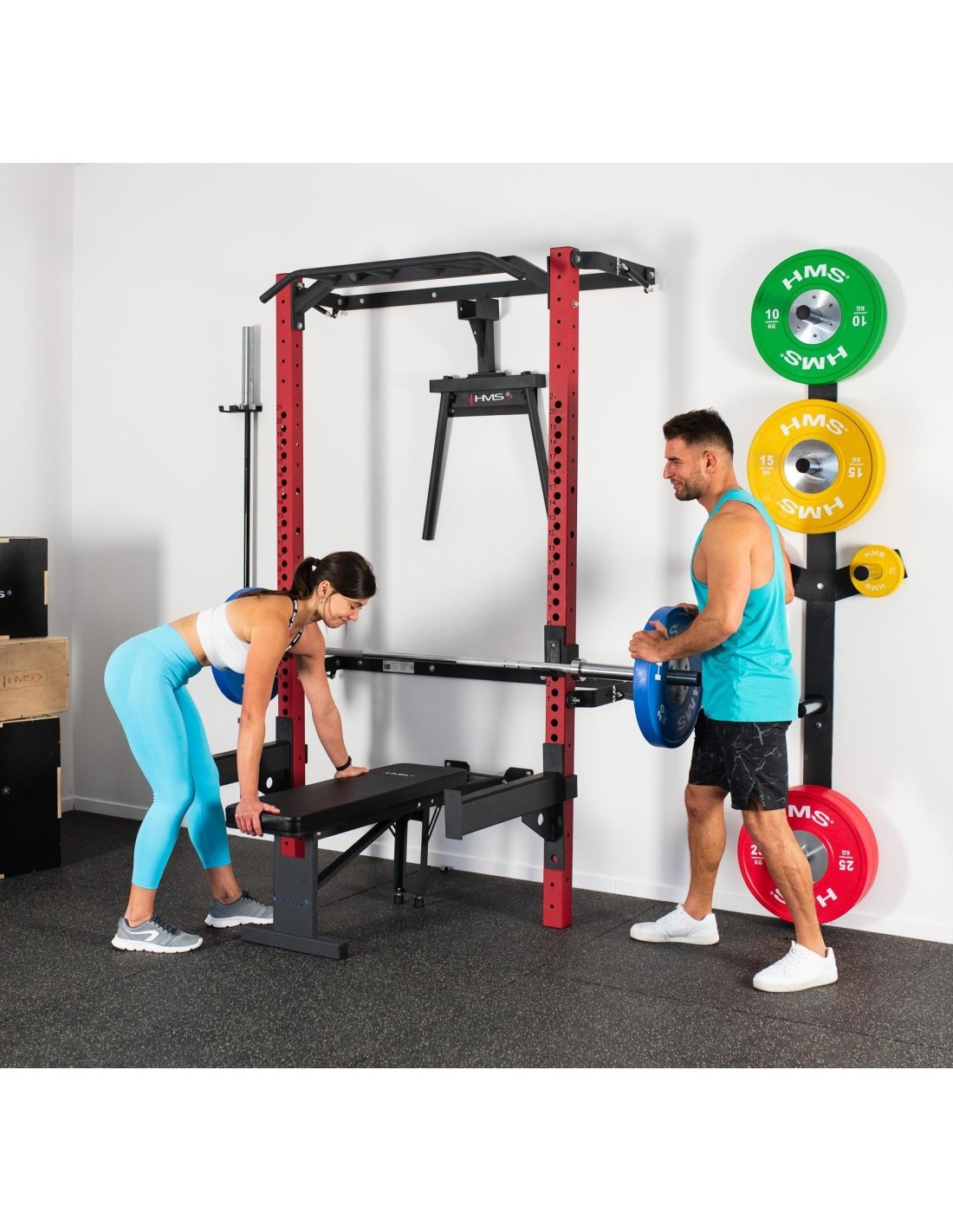 The KLT22 folding power rack from HMS has been designed to hit current market trends and meet the expectations of the most demanding customers. The cage in this variant is sold with additional equipment. In addition to a pull-up bar, barbell hooks and safety supports, you will find a folding flat bench, a handrail for dips, a wall-mounted weight rack and a bars holder. Such a set will expand your training range and provide new storage options for your equipment.