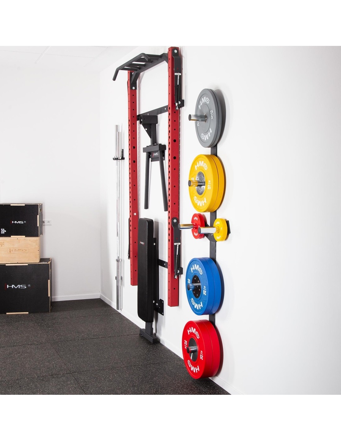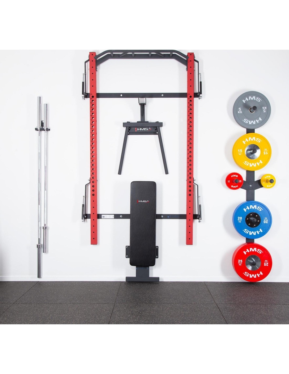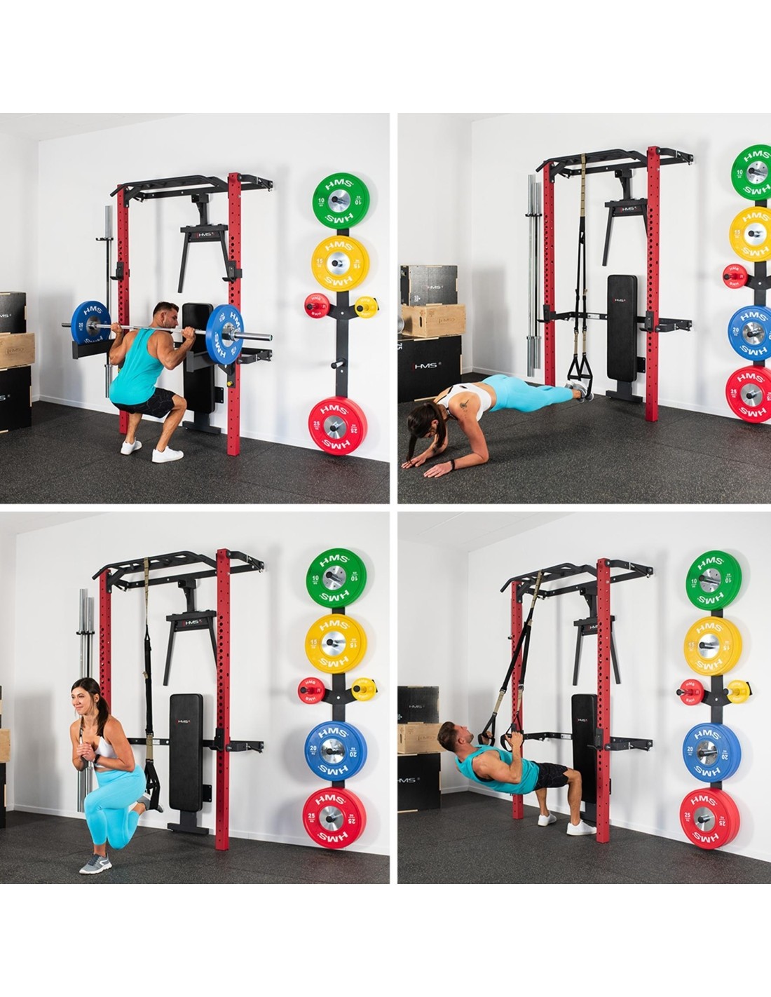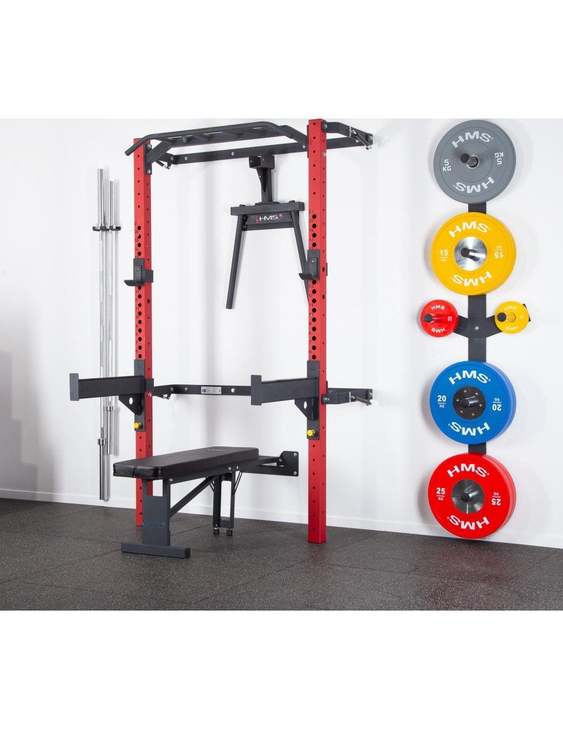 The KLT22 folding power rack from HMS has been designed to hit current market trends and meet the expectations of the most demanding customers. The cage in this variant is sold with additional equipment. In addition to a pull-up bar, barbell hooks and safety supports, you will find a folding flat bench, a handrail for dips, a wall-mounted weight rack and a bars holder. Such a set will expand your training range and provide new storage options for your equipment.