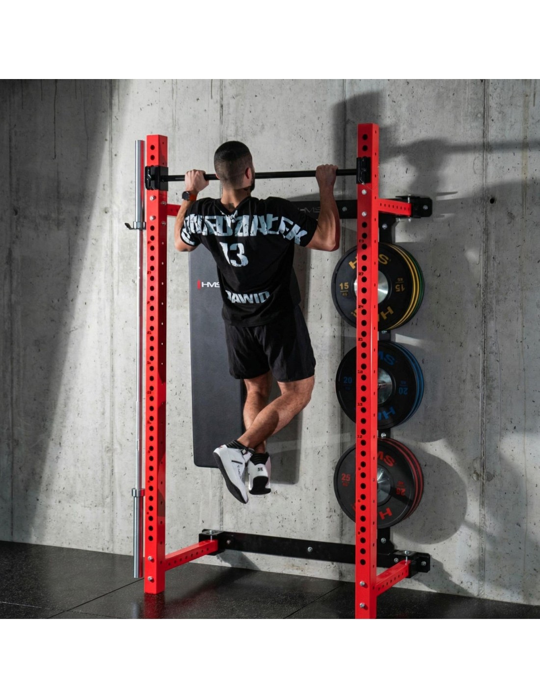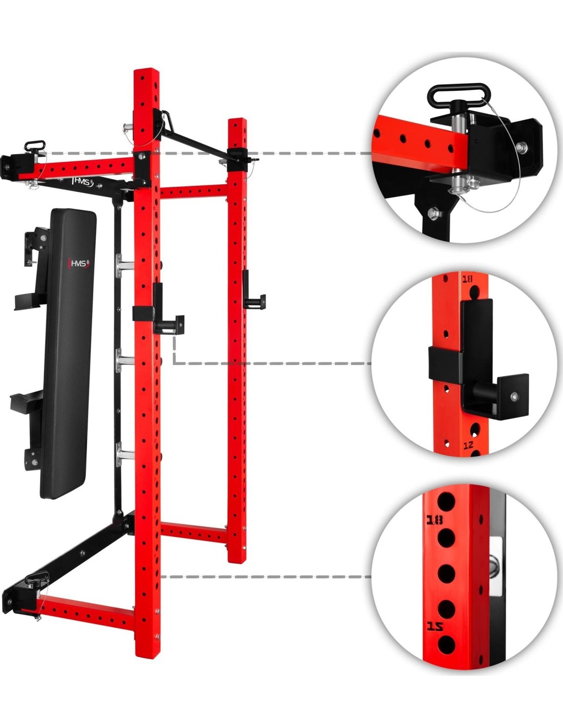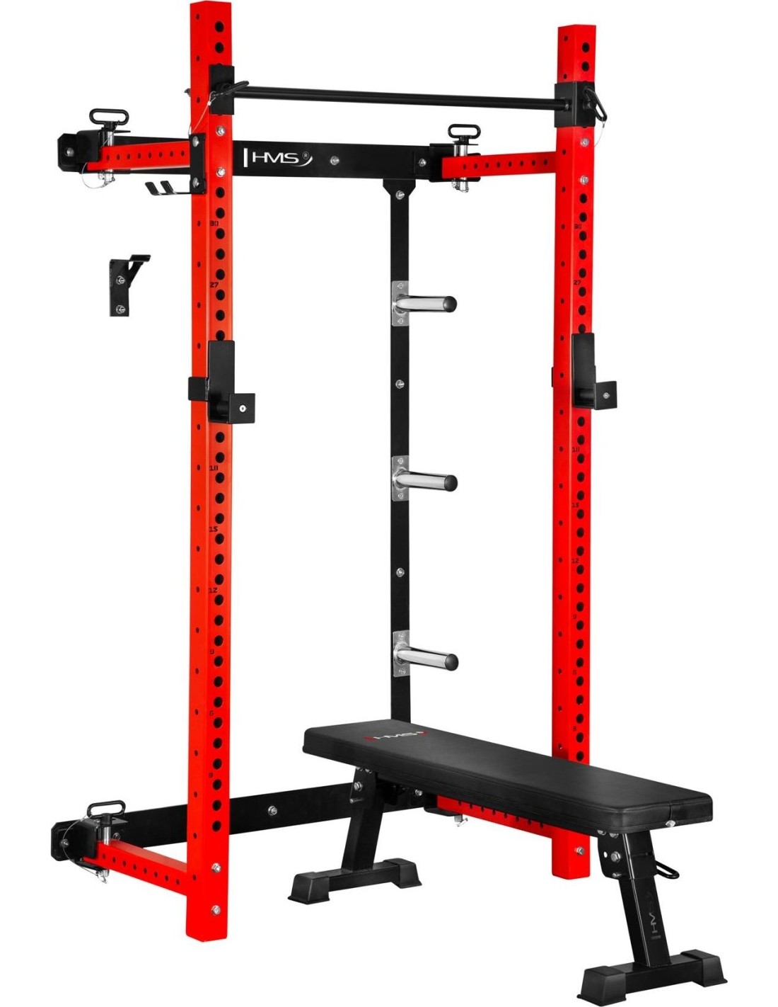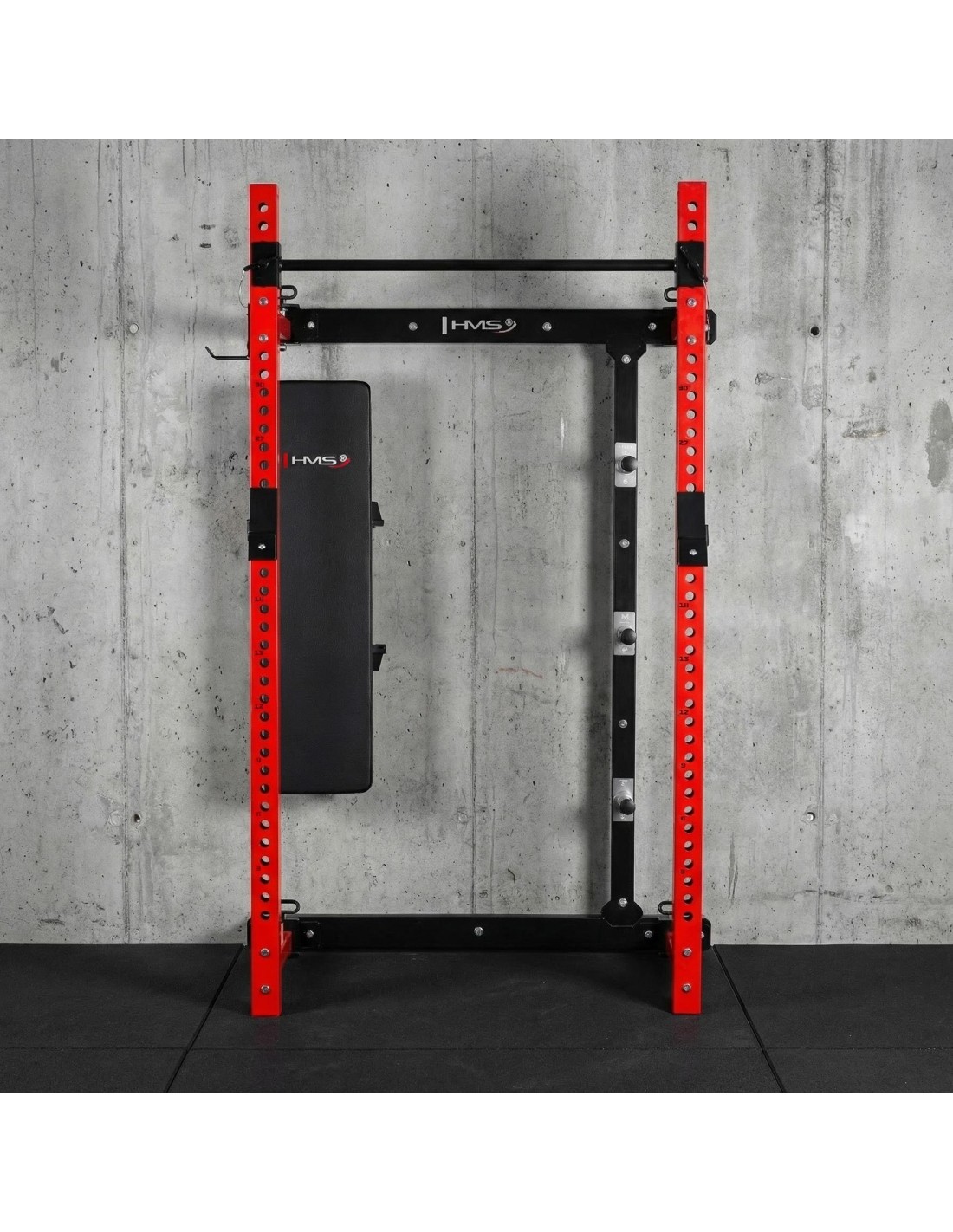 The KLT34 HMS Fitness power rack has been designed for home gyms where space efficiency and functionality are essential. Thanks to its side-sliding construction, it does not require a high ceiling, making it suitable for apartments, basements, and garages. A stable structure, high load capacity, and a foldable bench create a complete strength training station.