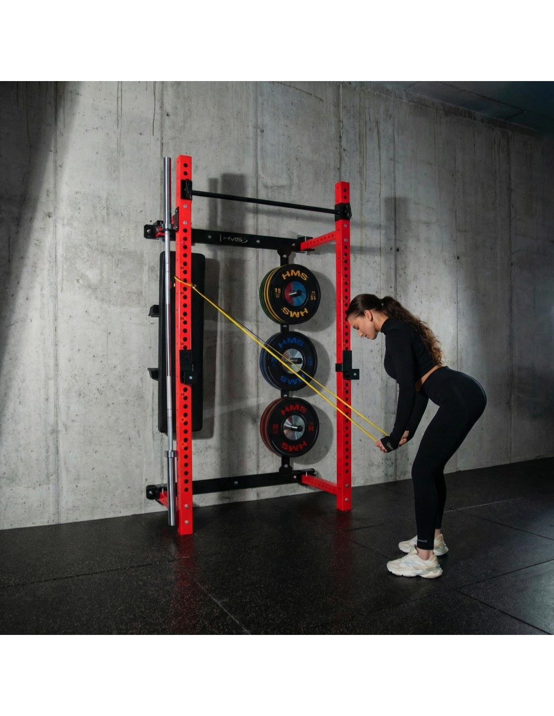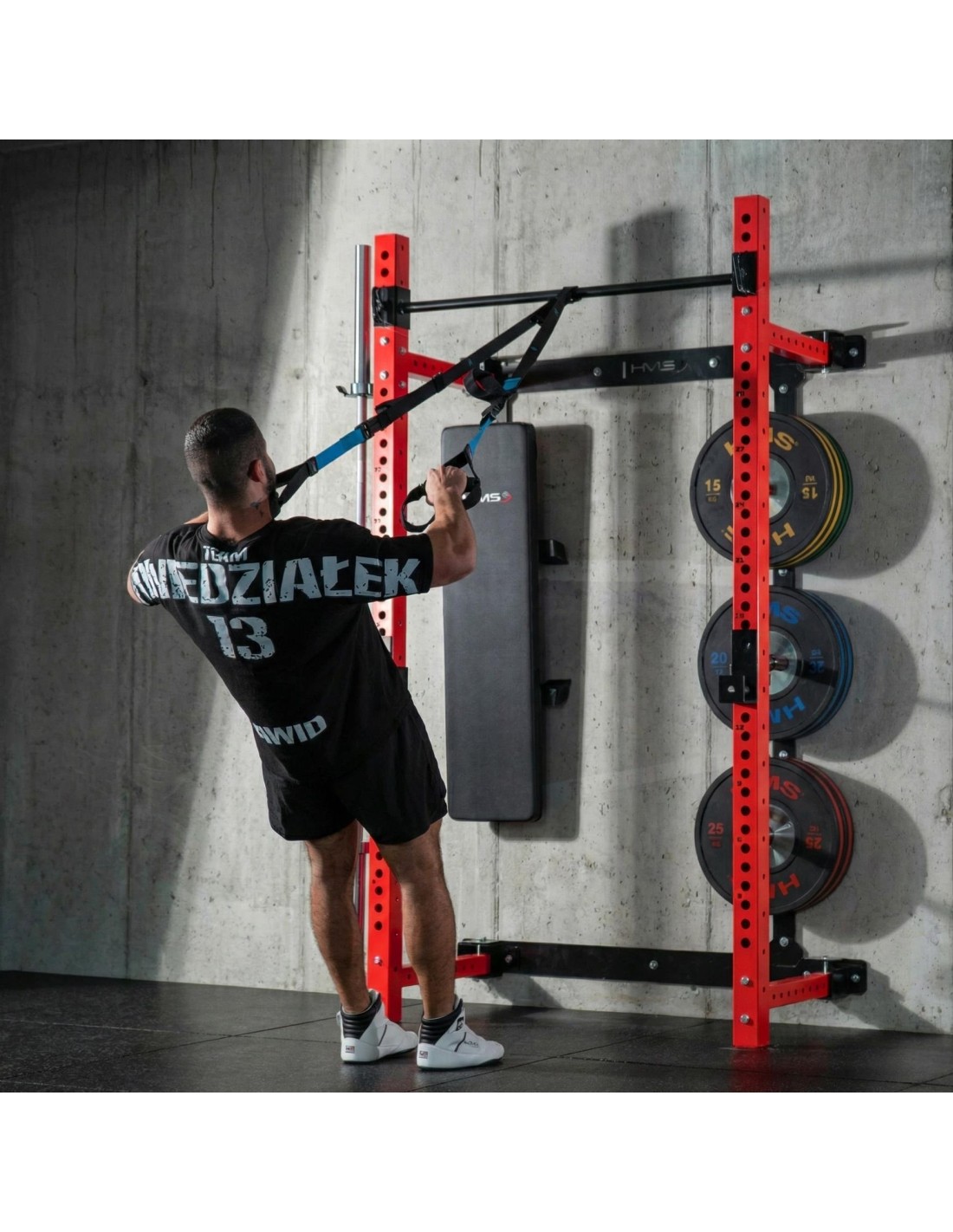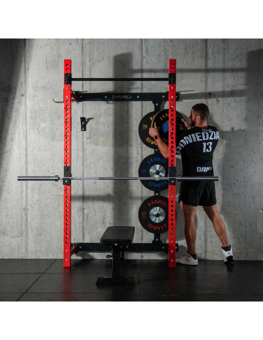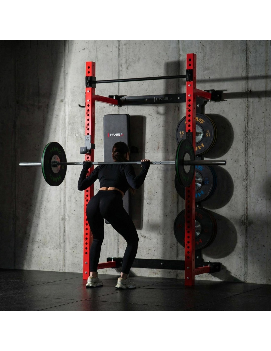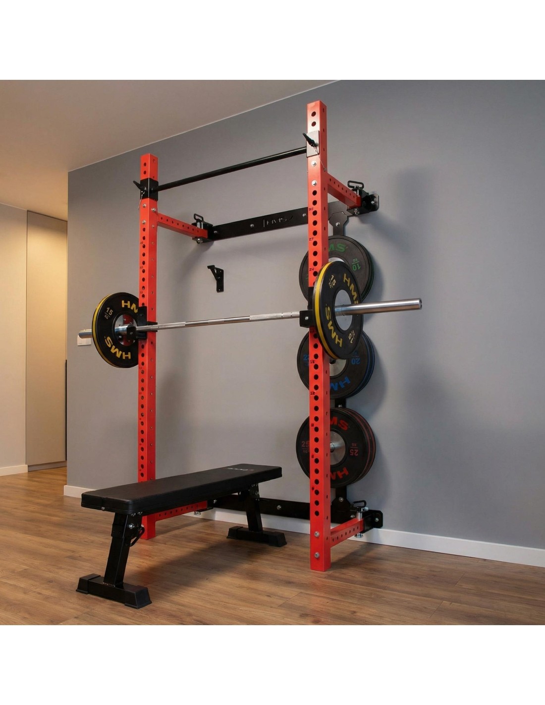 The KLT34 HMS Fitness power rack has been designed for home gyms where space efficiency and functionality are essential. Thanks to its side-sliding construction, it does not require a high ceiling, making it suitable for apartments, basements, and garages. A stable structure, high load capacity, and a foldable bench create a complete strength training station.