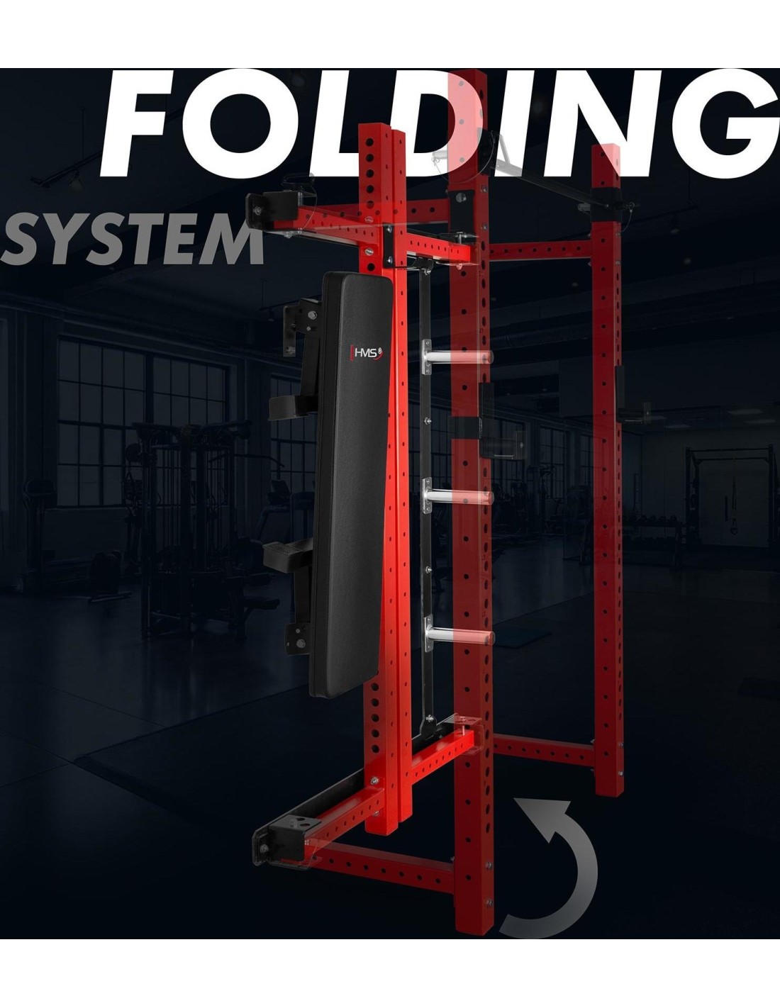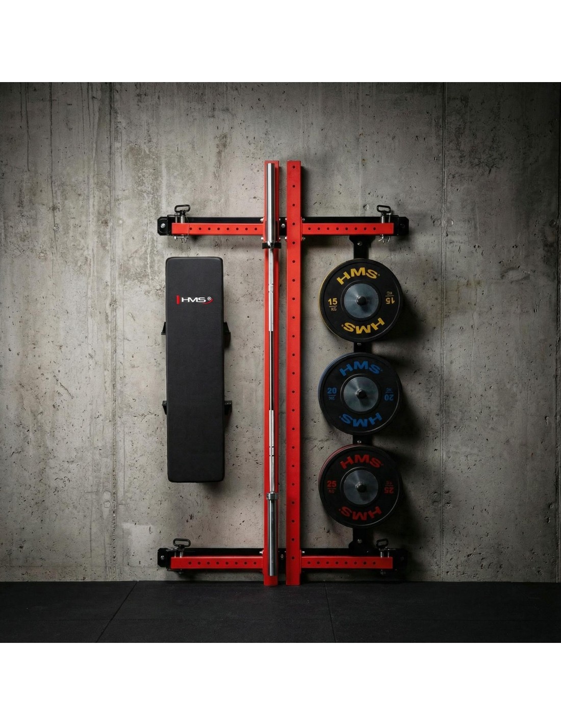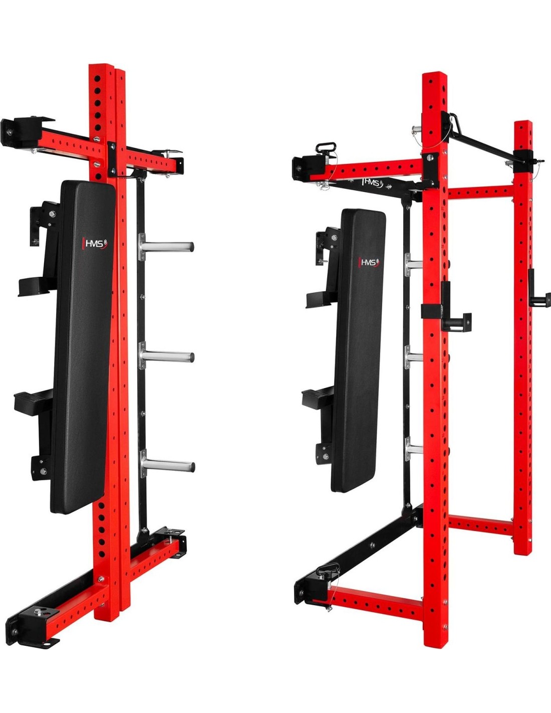 The KLT34 HMS Fitness rack is equipped with a foldable training bench, enabling exercises such as barbell presses, dumbbell workouts, and abdominal training. After the workout, the bench can be folded away, further increasing space efficiency.