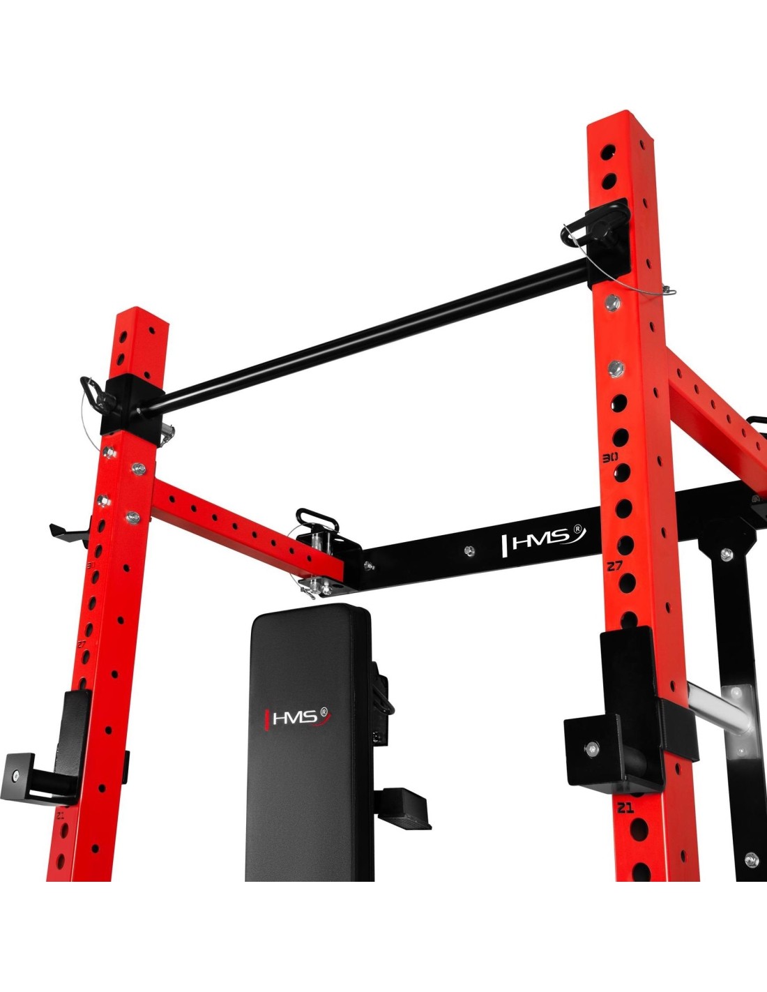 The rack structure includes a dedicated barbell storage space, making equipment organization easier and helping to keep the training area tidy. This practical solution is especially appreciated in home gyms.