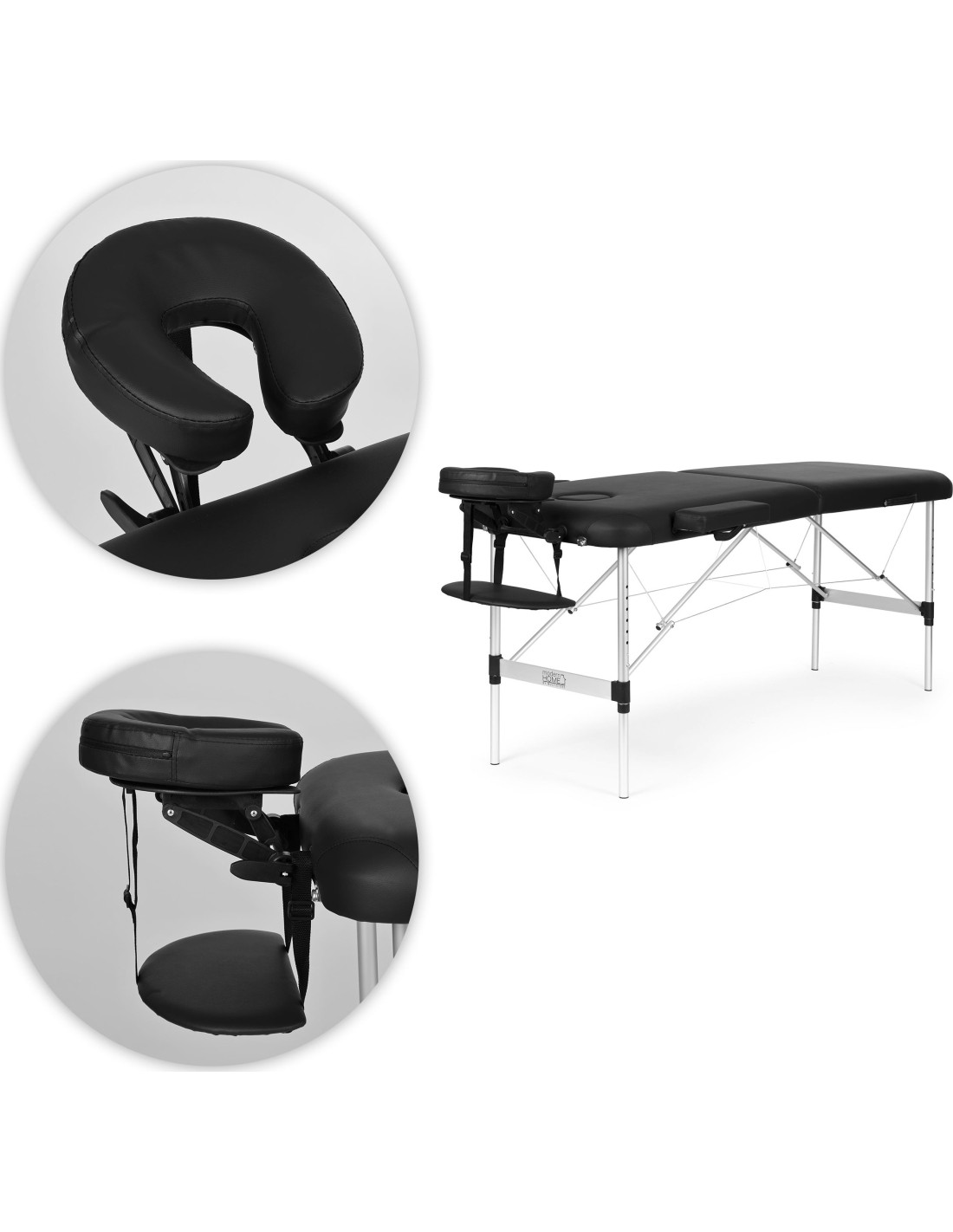 - Mechanizm regulacji zagłówka umożliwia płynną zmianę kąta i wysokości, zachowując naturalną pozycję szyi oraz swobodny oddech. Dodatkowy otwór w blacie na wysokości klatki piersiowej odciąża mostek przy leżeniu na brzuchu, a po włożeniu zatyczki blat pozostaje gładki i komfortowy w pozycji na plecach.