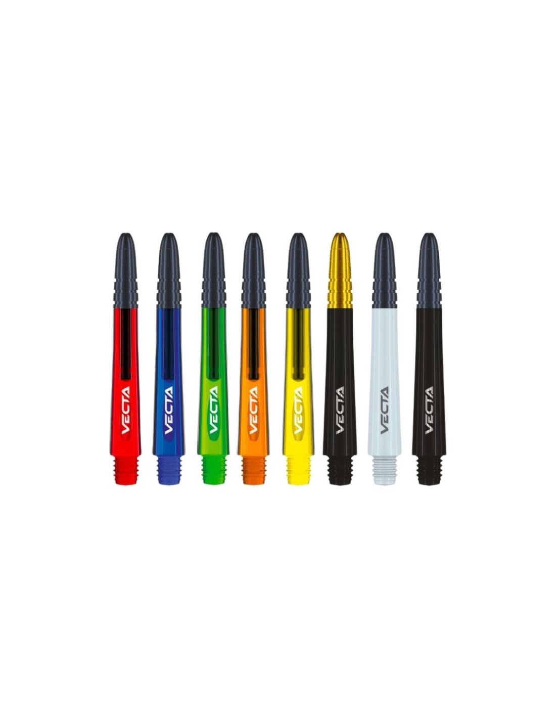 The set includes spare Dart Shafts Winmau Vecta Intermediate that are 37 millimeters long. These are tour-caliber composite shafts that combine a high impact polycarbonate body fused with low density aluminum alloy tips. They are streamlined, profiled and machined with extra deep slots for ultimate flight retention. They are available in a variety of bright colors.