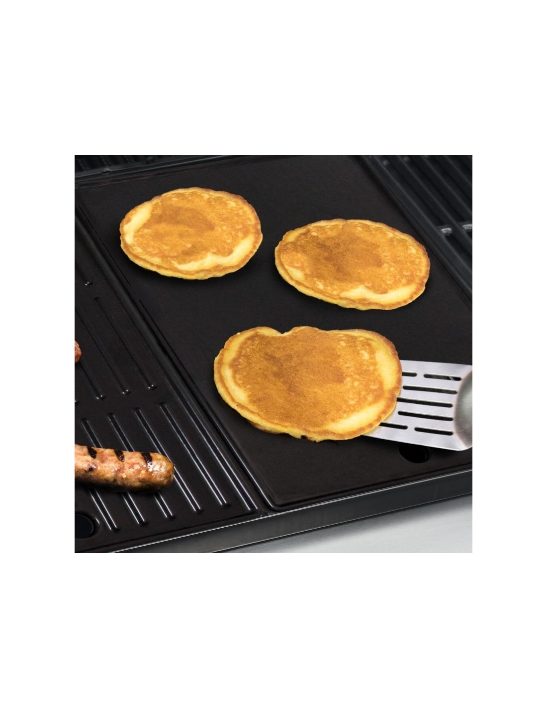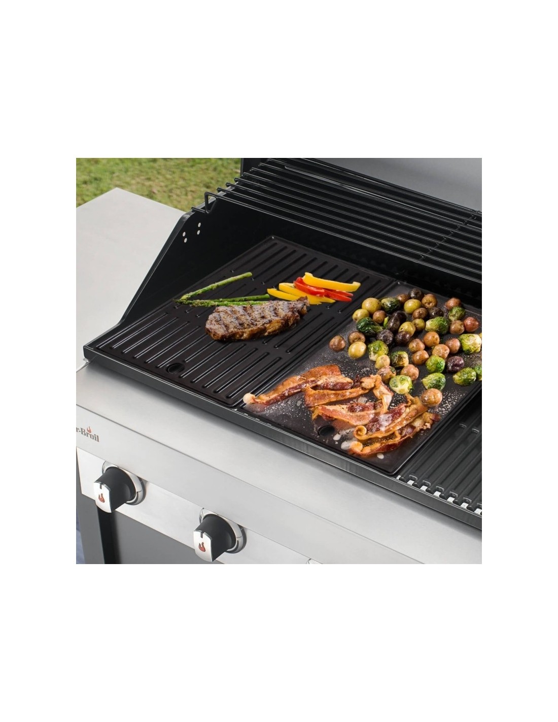 Su šia dvipuse kepimo plokštumą iš ketaus, skirta 4 degiklių char-broil griliams, galėsite gaminti kepinius, tokius kaip daržovės, jūros gėrybes, išsikepti blynus ar kiaušinius.Specifikacijos:Matmenys: 1 x 43,5 x 26 cmSvoris: 5 kg