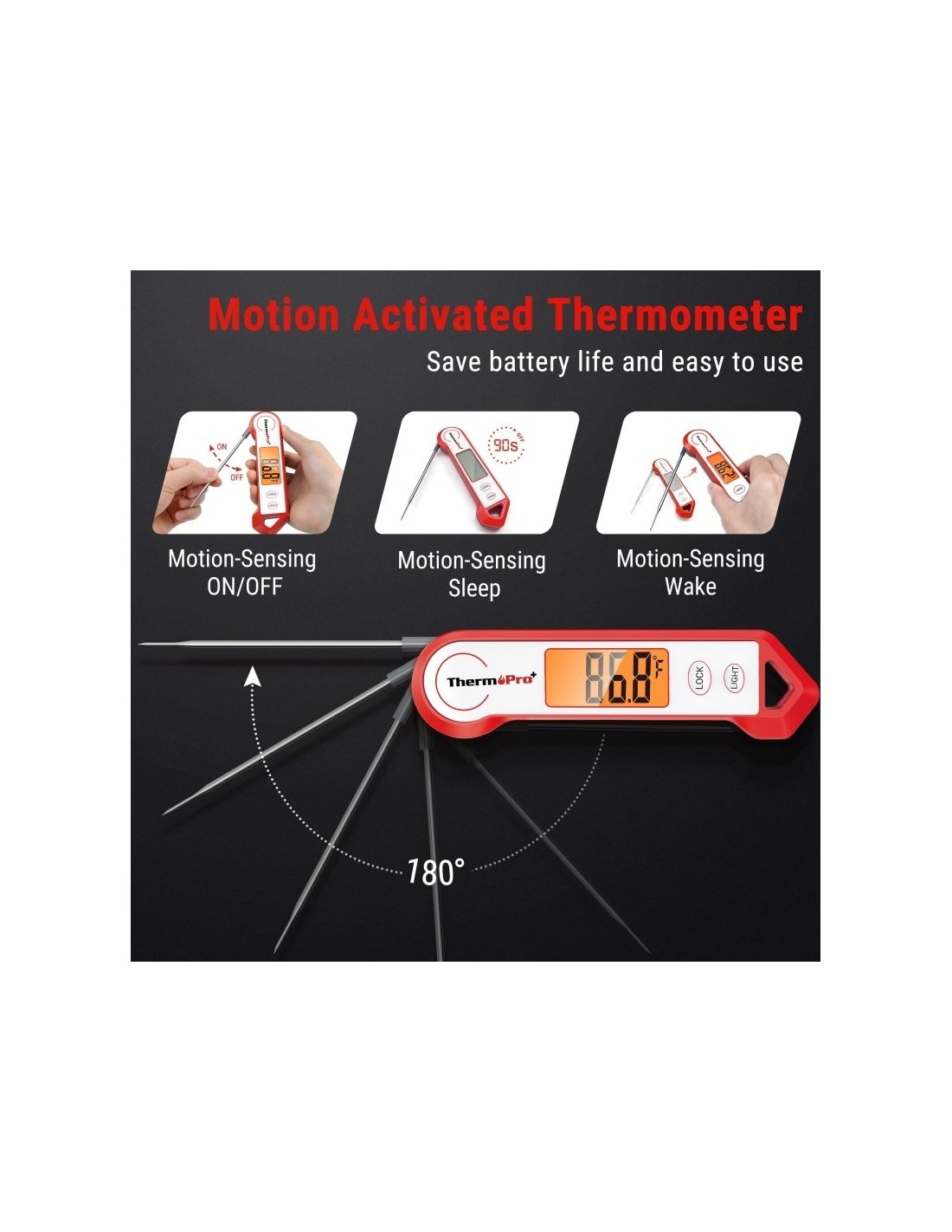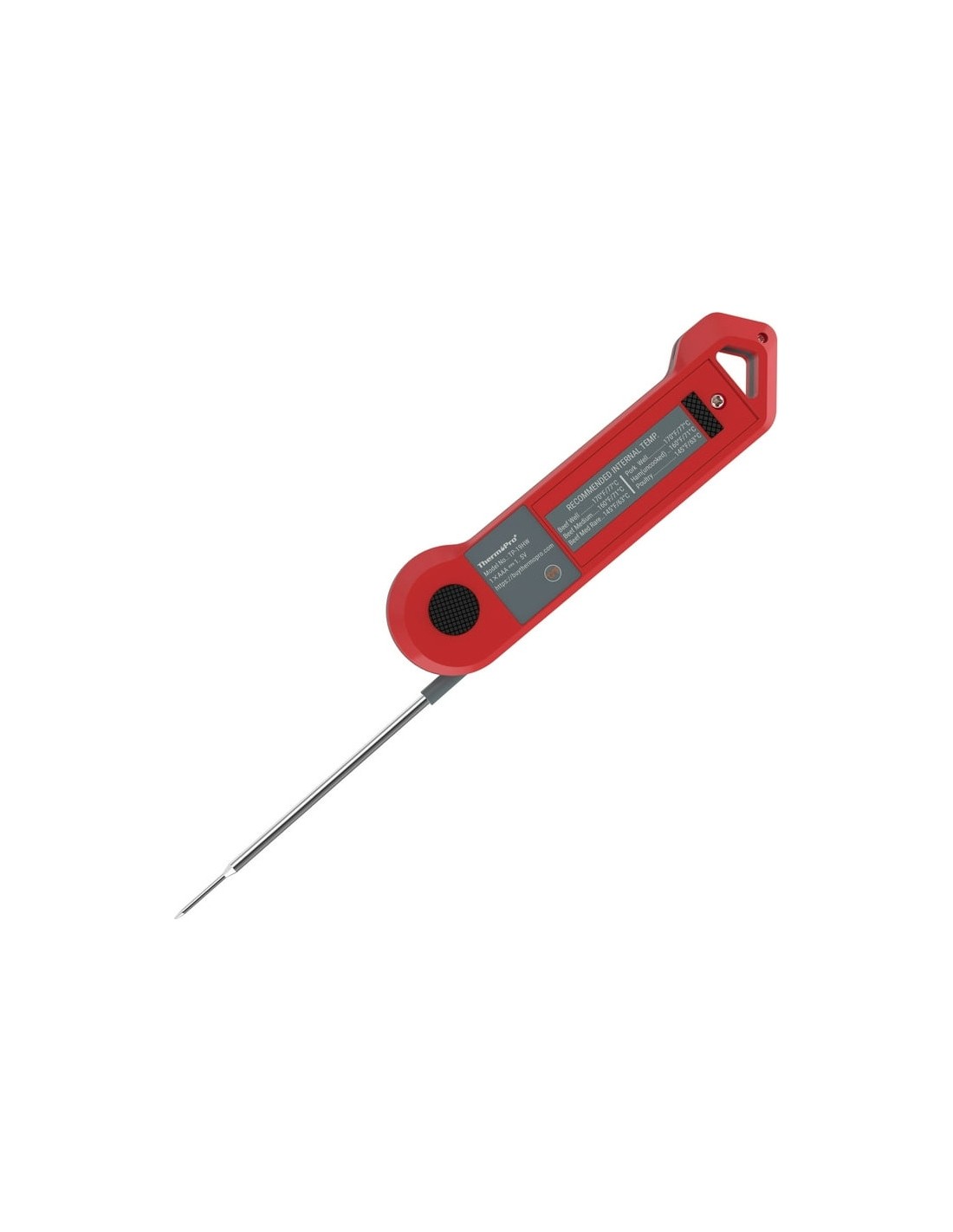 Kepkite mėsą tiksliai su ThermoPro TP19HW! Šis kokybiškas skaitmeninis termometras Jums pateiks tikslius temperatūros rodmenis per 3-4 sek. kiekvieną kartą. Termometras yra sulenkiamas, turi magnetinę nugarėlę ir kabliuką, tad jį galima pakabinti ant kepsninės ar virtuvinės spintelės. TP19HW yra puikus pasirinkimas tiek patyrusiems tiek pradedantiesiems kepėjams.• Atsparumas: Jums nereiks jaudintis kai termometras sušlaps ar bus paliktas lietuje. TP19HW yra 100% vandeniui atsparus prietaisas, tad galima jį plauti po tekančiu vandeniu.• Greitis: Šis momentinis termometras turi nerūdijančio plieno zondą, o aukštos kokybės sensorius vos per 3-4 sekundes parodys tikslią maisto temperatūrą.• Tikslumas: Termometras turi didelį temperatūros matavimo diapozoną (-50° ~ 300° C). • Kalibravimas: Termometro kalibracijos rėžimas leis Jums pataisyti sensoriaus rodmenis, jei to prireiktų po ilgo naudojimo.• Automatiškai pasisukantis LCD ekranėlis su apšvietimu: Apvertus termometrą ekranėlio rodmenys automatiškai pasisuka 180 laipsnių, o apšvietimas padės perskaityti rodmenis tamsoje ar prieblandoje.Išmanumas ir patogumas: Po 90 sek. nenaudojimo termometras pereina į miego rėžimą ir įsijungia vos paėmus į rankas.Savybės:○ 3-4 sek. matavimo laikas○ Temp. diapozonas: -50 iki 300° C○ Tikslumas: ± 0.5° C○ Automatinis miego rėžimas ○ Pasisukantis ekranėlis