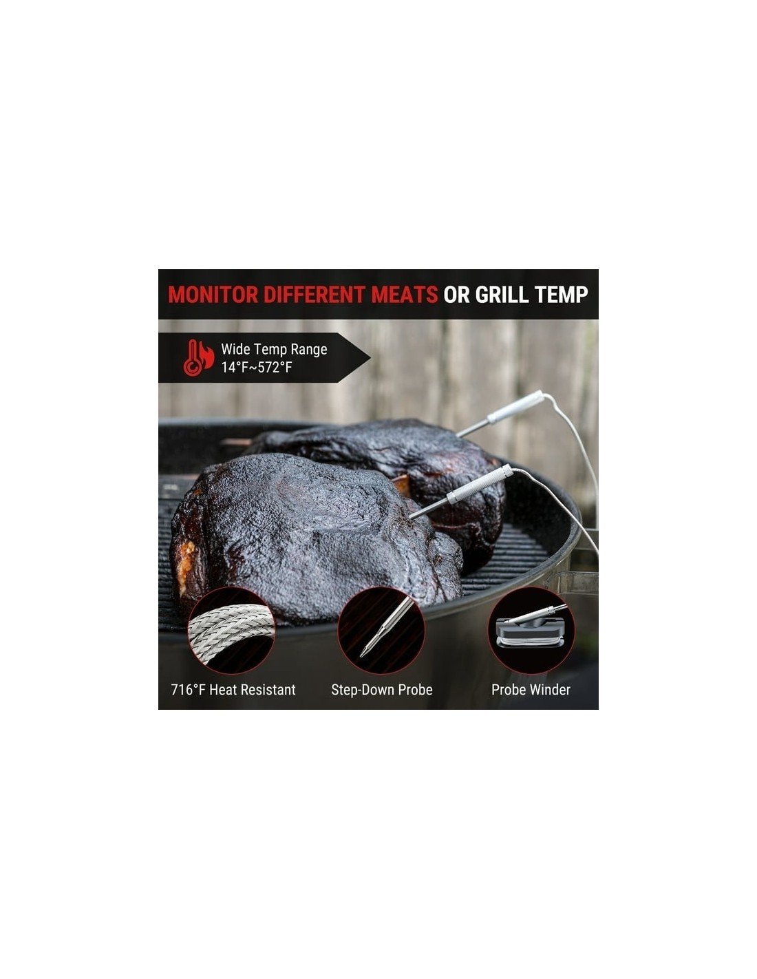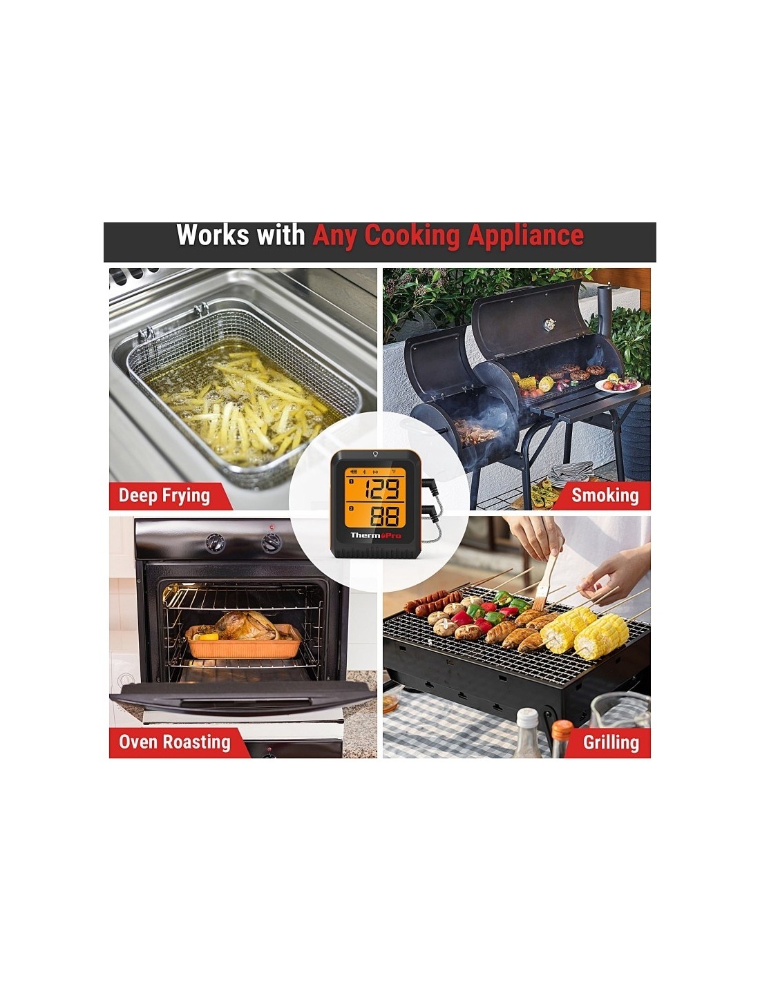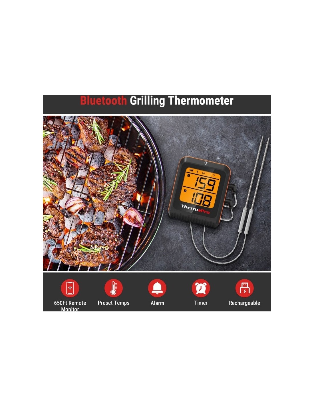 Pagerinkite savo kepimo patirtį su ThermoPro TP920W! Termometras turi 200 metrų Bluetooth atstumą, tad leis lengvai stebėti maisto kepimo būseną Jūsų telefone. Šis termometras turi 2 nerūdijančio plieno zondus, kurie pasirūpins, kad Jūsų ruošiamas maistas bus iškeptas idealiai, sekant vidinę, bei išorinę temperatūrą. ThermoPro BBQ programėlė palengvins kepimo eigą. Joje gausite pranešimus dėl maisto, rekomenduojamas temperatūras, grafikus, modifikuojamus priminimus. Programėlės algoritmas parinks tinkamus kepimo laikus, tad galėsite mėgautis tobulai iškeptu maistu kiekvieną kartą.Termometras taip pat turi pakraunamą bateriją ir ryškų LCD ekranėlį. • 200 metrų belaidis ryšys: ThermoPro TP920W turi Bluetooth 5.0 technologiją, kuri teikia stiprų ir nenutrūkstantį ryšį, kad galėtumėte stebėti temperatūrą savo telefone. • Tikslumas: Termometras turi 2 nerūdijančio plieno zondus kurie tiksliai matuoja vidinę ir išorinę temperatūra iki 300° C.• Valdykite laiką: Programėlės algoritmas parinks kepimo laikus, kad maistas būtų paruoštas idealiai.• Programėlė: Gaukite pranešimus dėl temperatūros, keiskite nustatymus, sekite kepimo eigą savo išmaniajame telefone.• Įkraunamas: Termometras yra įkraunamas ir turi ryškų LCD ekranėlį su apšvietimu. Pilnai pakrauta, baterija tarnaus iki 8 mėn, tad dažnai jos krauti nereiks. Savybės:○Temperatūros diapozonas nuo -10 iki 300° C○Termometro svoris - 0,29kg○Patogus valdymas programėlėje○Pakraunama baterijaPakuotėje rasite:1x Naudojimo instrukciją1x Skaitmeninį termometrą1x Zondo laikiklį1x USB laidą2x Zondus2x Laido laikiklį