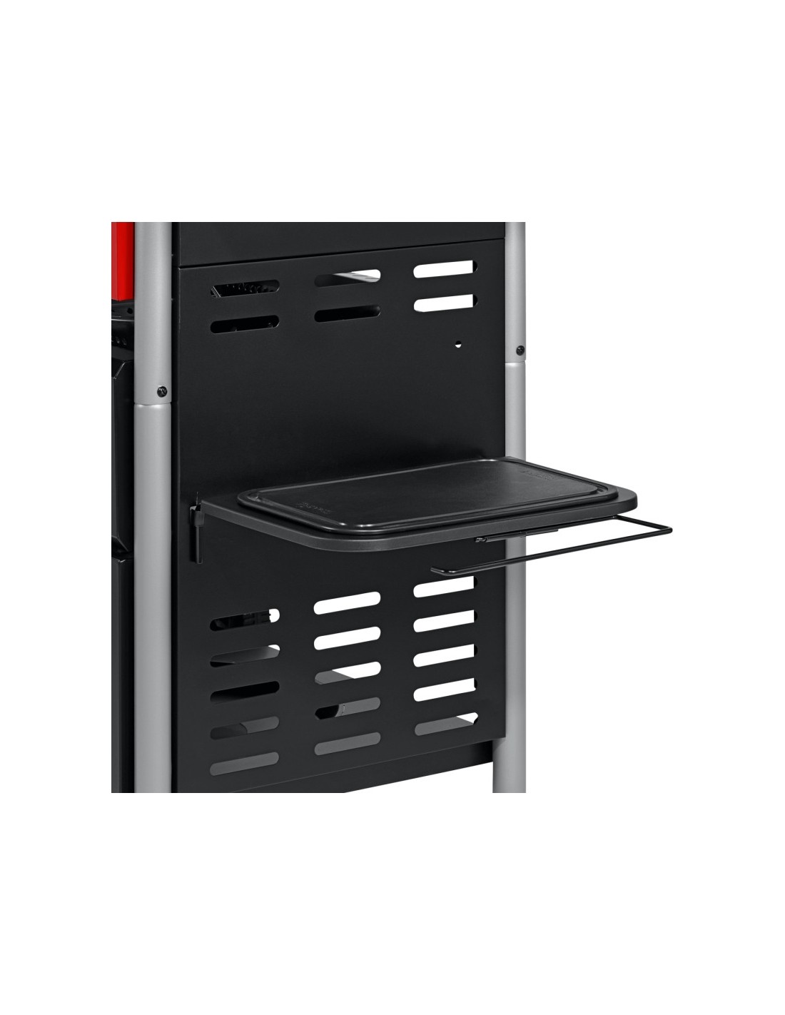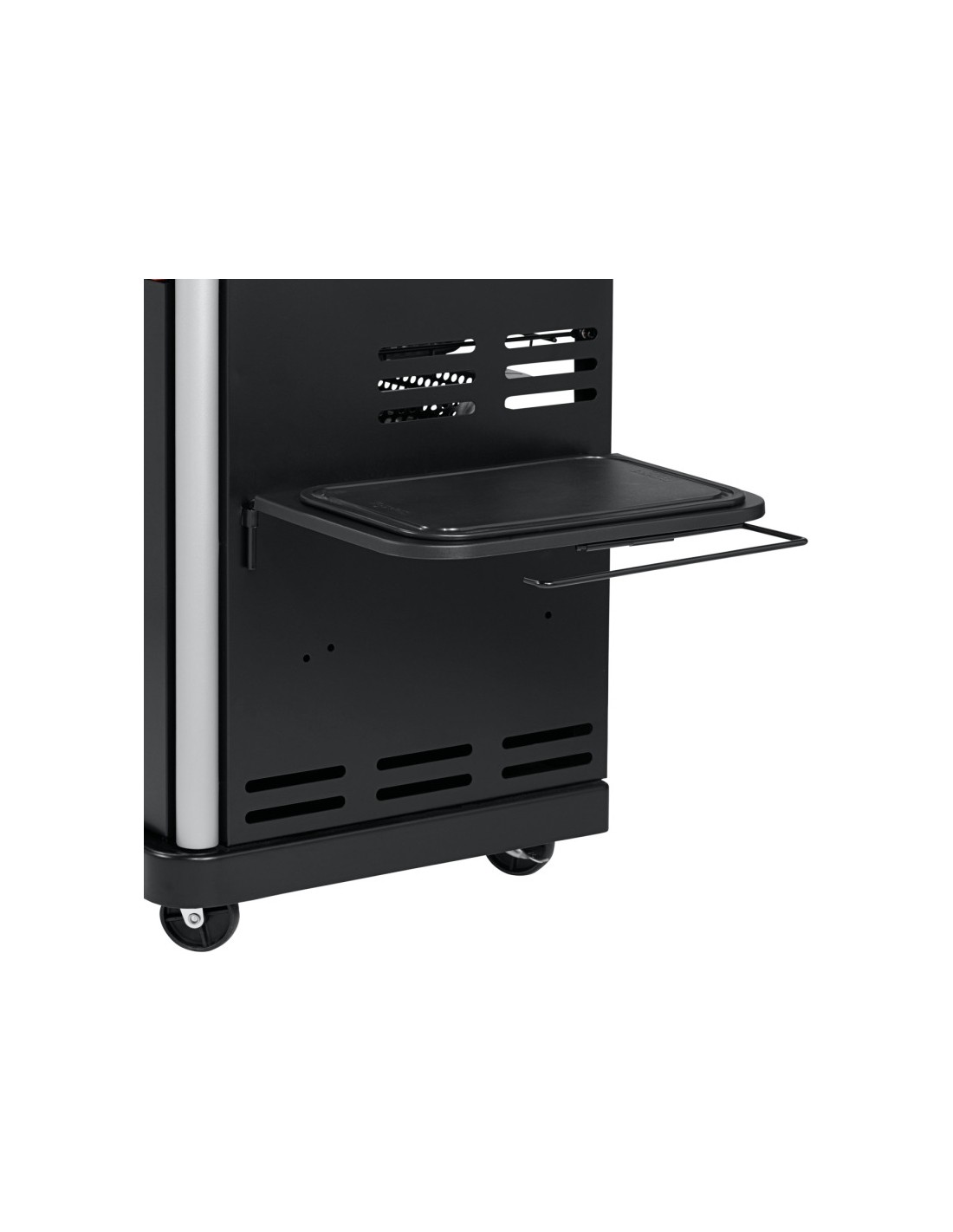 Char-Broil® MADE2MATCH daugiafunkcinė lentyna suteikia papildomos darbo vietos, kurioje įrengta pjaustymo lenta, virtuvinių ritinėlių laikiklis ir šiukšlių maišo apvadas.