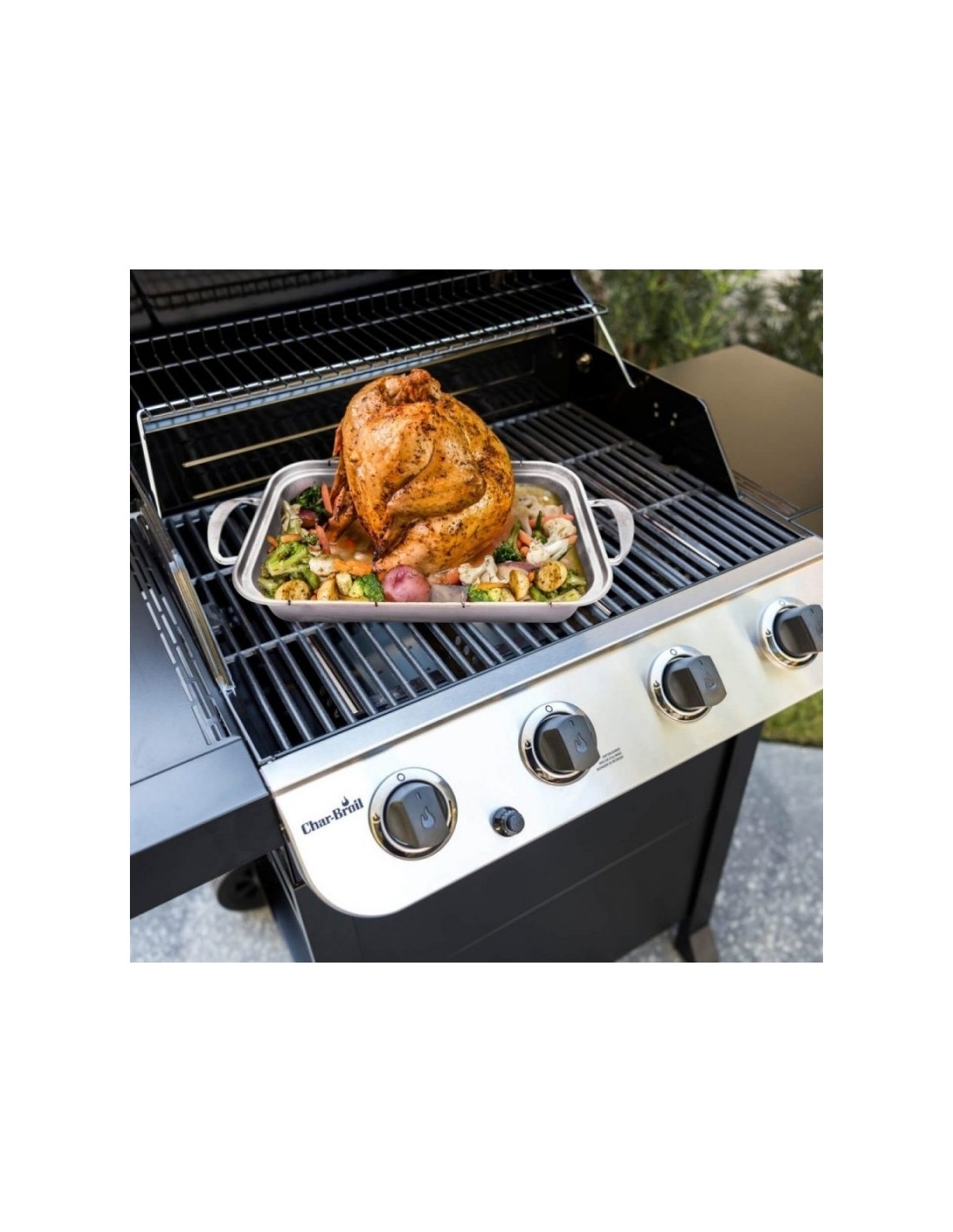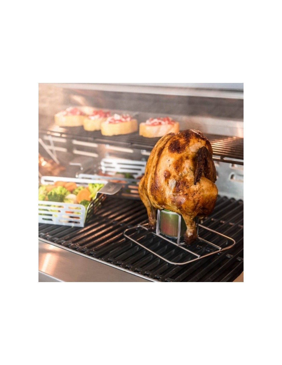 Vištos laikiklis GRILL + Be-can buvo specialiai sukurtas tam, kad būtų galima gaminti BBQ klasiką: alaus užpilta vištiena. Paprasčiausiai suždėkite alaus skardinę ant stovo ir uždėkite vištą ant jos. Taip vištiena įgaus nuostabų alaus aromatą. Galite sujungti lentyną su GRILL + Skrudinimo indu ir į ją įdėti iki dviejų laikiklių.