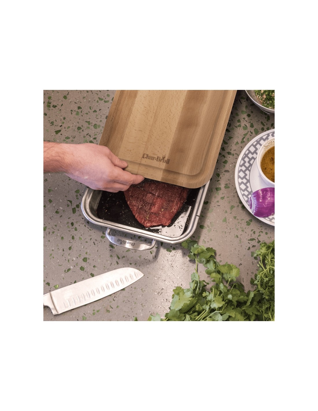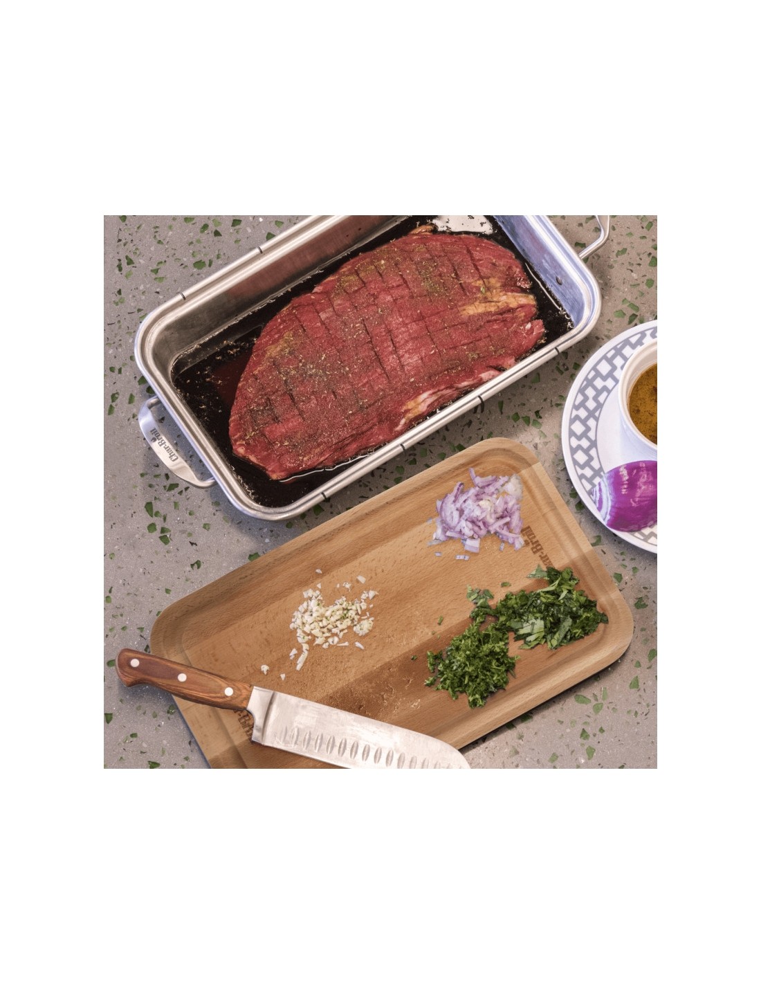Kepimo indas ir pjaustymo lenta yra aukščiausios kokybės maisto ruošimo priedas. 23 x 36 cm ilgio giluminis nerūdijančio plieno indas yra pakankamai tvirtas, kad atlaikytų didelį karštį, puikiai tinka naudoti ir orkaitėje.