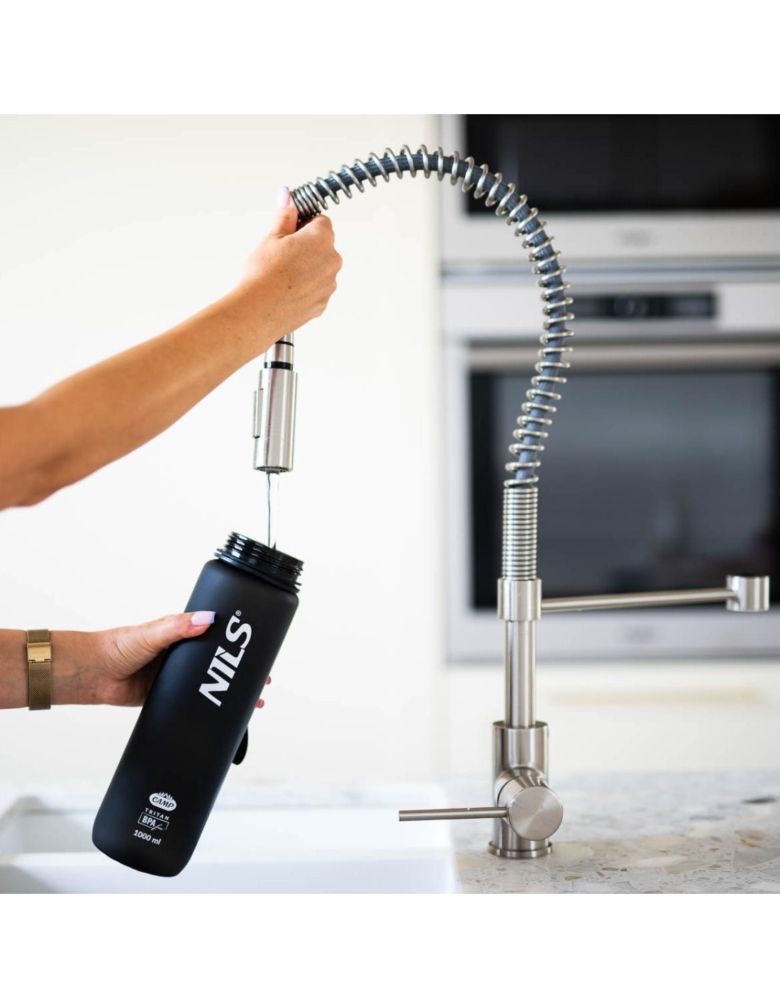 The NCD68 tritan bottle by Nils CAMP is characterized by an unusual combination of durability, ergonomic shape and functionality. The Tritan bottle has been designed so that it can accompany us throughout the day. Thanks to the compartment located on the back of the bottle, we can monitor the level of our hydration on an ongoing basis. The bottle has a sealed rubber mouthpiece connected to a straw and an innovative opening system. To be able to drink, move the pin down and press the button - then the lock of the hole is released. On the other hand, to block the hole, just slide the cotter pin back up. The NCD68 also has an additional handle in the form of a wrist strap, which is useful during transport. The whole thing looks very practical and original. Tritan is a very durable and lightweight material that is resistant to high temperatures. The use of modern materials ensures its optimal properties for storing water, drinks or tea. The bottle is very easy to maintain, can be sterilized and washed in the dishwasher. Unlike plastic, tritan retains its properties and aesthetics for a long time. The tritan bottle can be filled with hot liquid without fear of damaging it. Tritan bottles are also resistant to sub-zero temperatures. Even freezing water in a bottle will not damage it, as is the case with plastic. Tritan also does not emit harmful compounds and effectively protects against the adverse effects of UV rays. Specification: Material: BPA-free tritan, PP Dimensions: Height: 28 cm Diameter: 7.7 cm Capacity: 1000 ml Single wall Product weight: 190g Marks: Not intended for commercial use 24-month warranty
