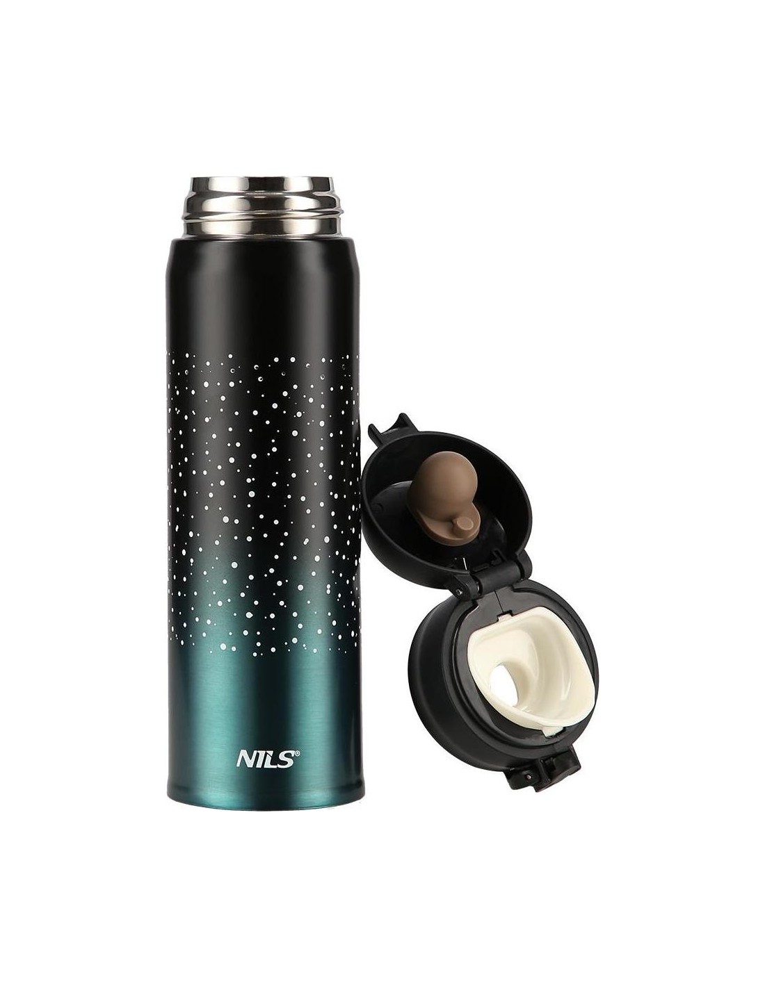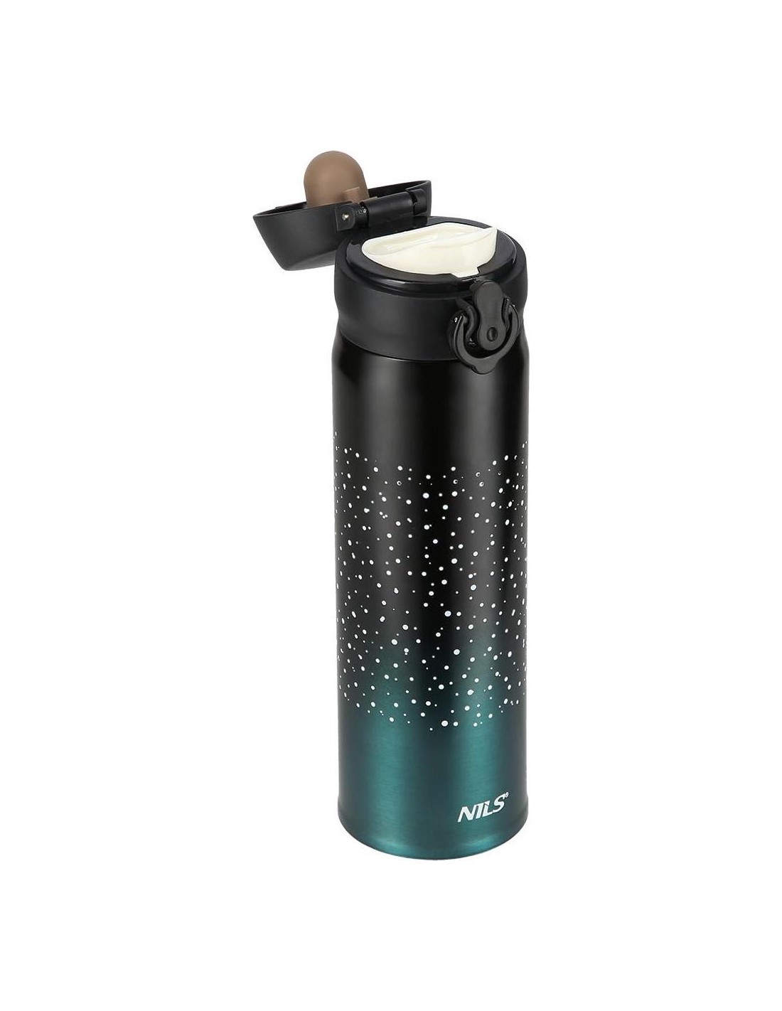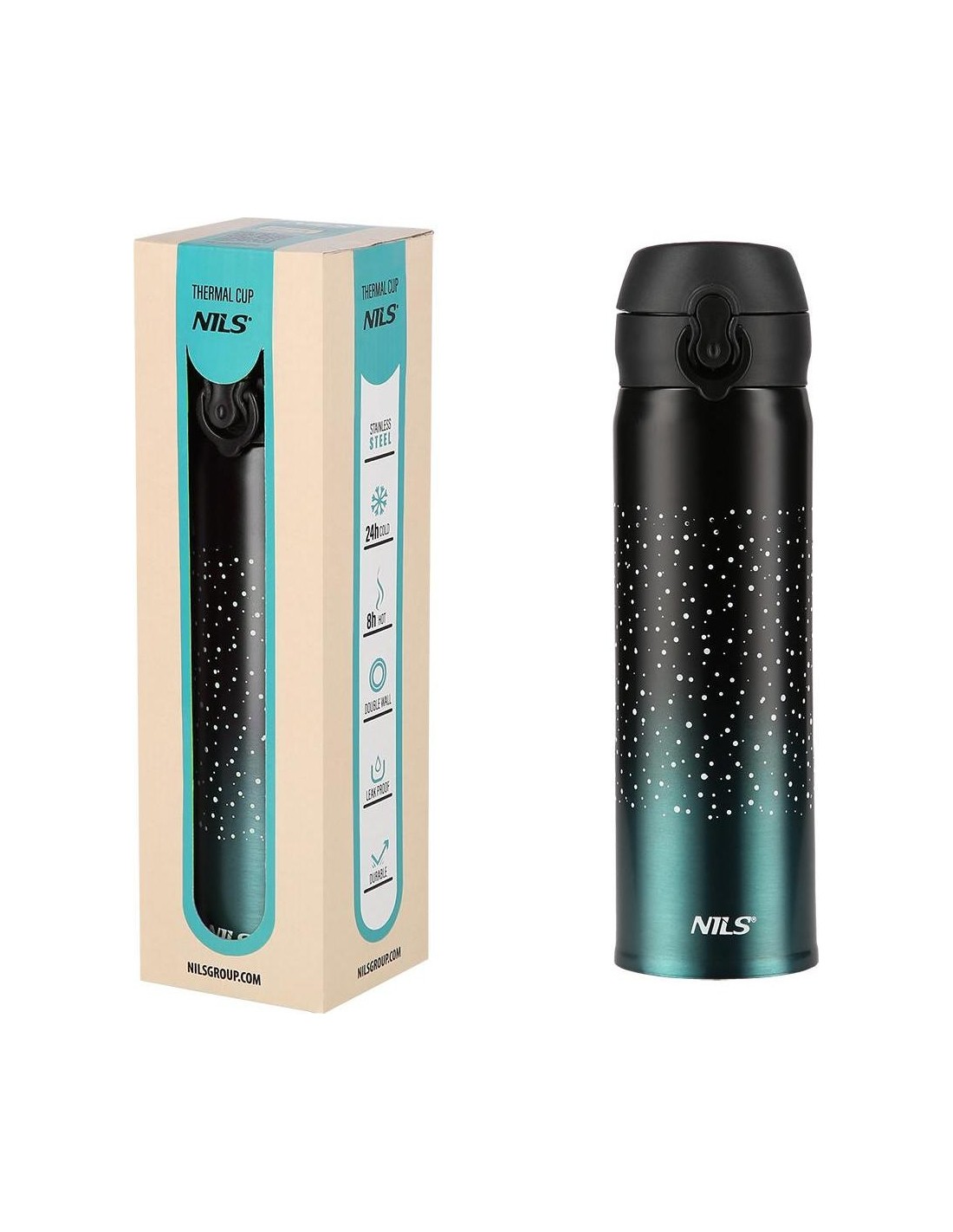 NCB11 Nils thermal mug features both simple structure and original design! NCB11 is a thermal mug made of the stainless steel with a double wall due to which it keeps the temperature of hot drinks for 12 hours and cold drinks for 24 hours. What makes the NCB11 mug unique is the opening system with a locking option making the thermal mug extremely leak-proof. Consequently, you can take it anywhere and not worry about any leaks. To release the lock and open the lid just slide the lock button down, then press the opening button and there you go, the mug opens automatically! Specification: Material: stainless steel Dimensions: Height: 22.5 cm Diameter - top 6.5 cm Volume: 500 ml. Double wall: yes Keeping warm liquids: up to 12 h Keeping cold liquids: up to 24 h Opening lock: yes Product weight: 220 g Remarks: Not intended for commercial use Guarantee 24 months