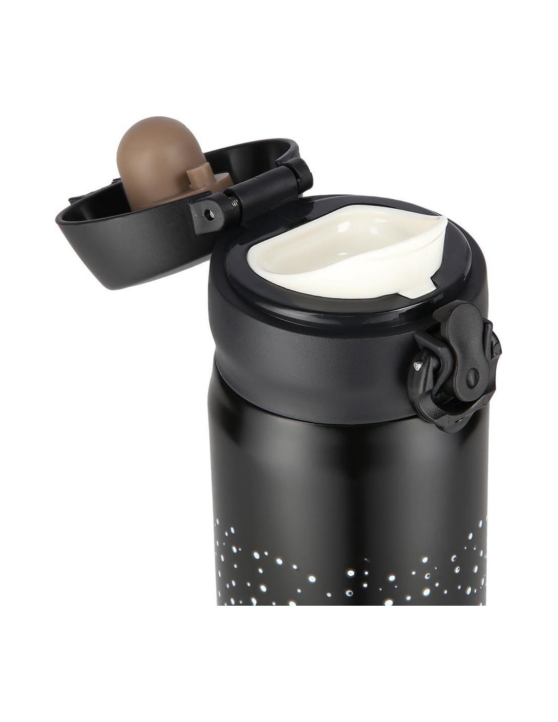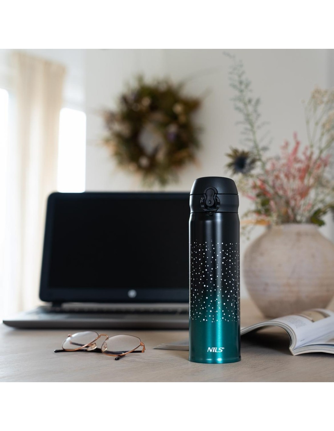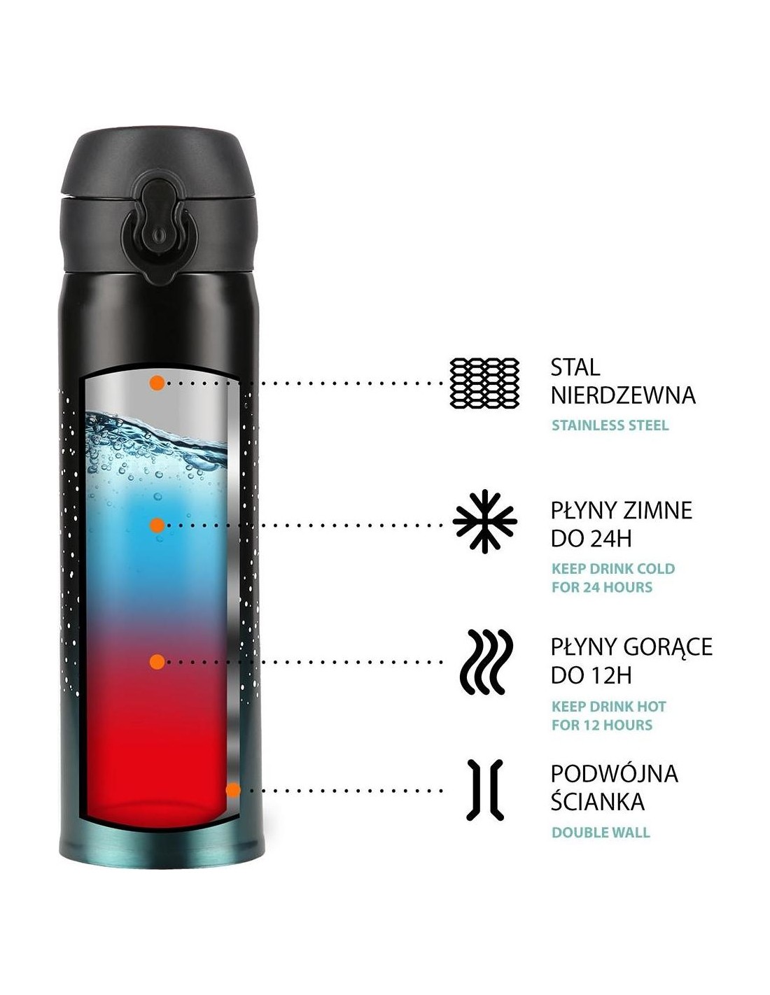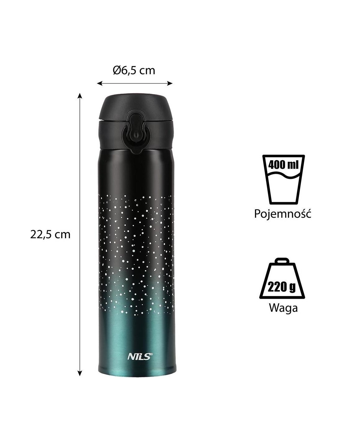 NCB11 Nils thermal mug features both simple structure and original design! NCB11 is a thermal mug made of the stainless steel with a double wall due to which it keeps the temperature of hot drinks for 12 hours and cold drinks for 24 hours. What makes the NCB11 mug unique is the opening system with a locking option making the thermal mug extremely leak-proof. Consequently, you can take it anywhere and not worry about any leaks. To release the lock and open the lid just slide the lock button down, then press the opening button and there you go, the mug opens automatically! Specification: Material: stainless steel Dimensions: Height: 22.5 cm Diameter - top 6.5 cm Volume: 500 ml. Double wall: yes Keeping warm liquids: up to 12 h Keeping cold liquids: up to 24 h Opening lock: yes Product weight: 220 g Remarks: Not intended for commercial use Guarantee 24 months
