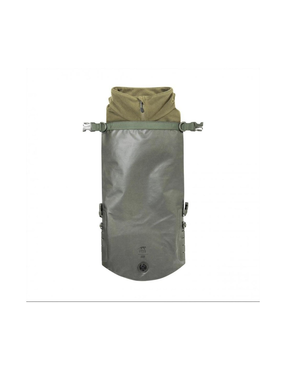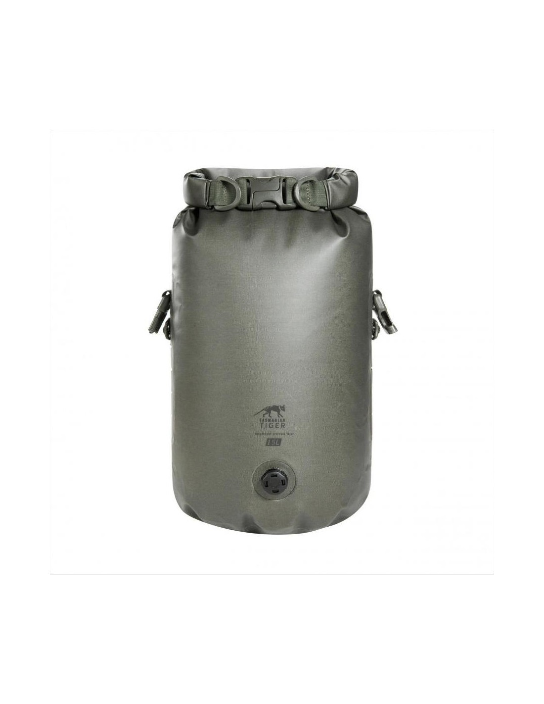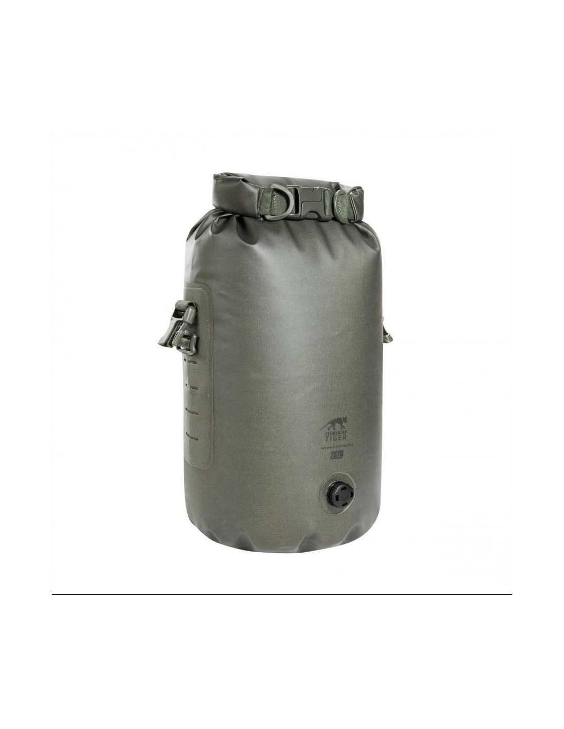 The bag's airtightness is ensured by a roll-top closure, consisting of a strong snap buckle and wrapped material, which effectively prevents water from entering the bag. A valve has been placed on the front of the bag to allow dirt to drain out and compress the contents.