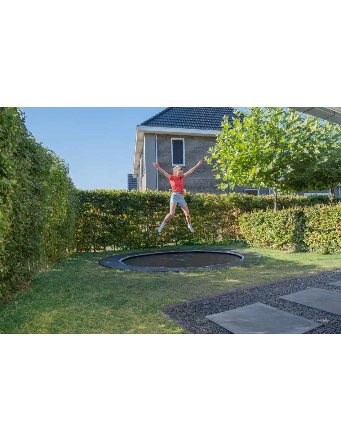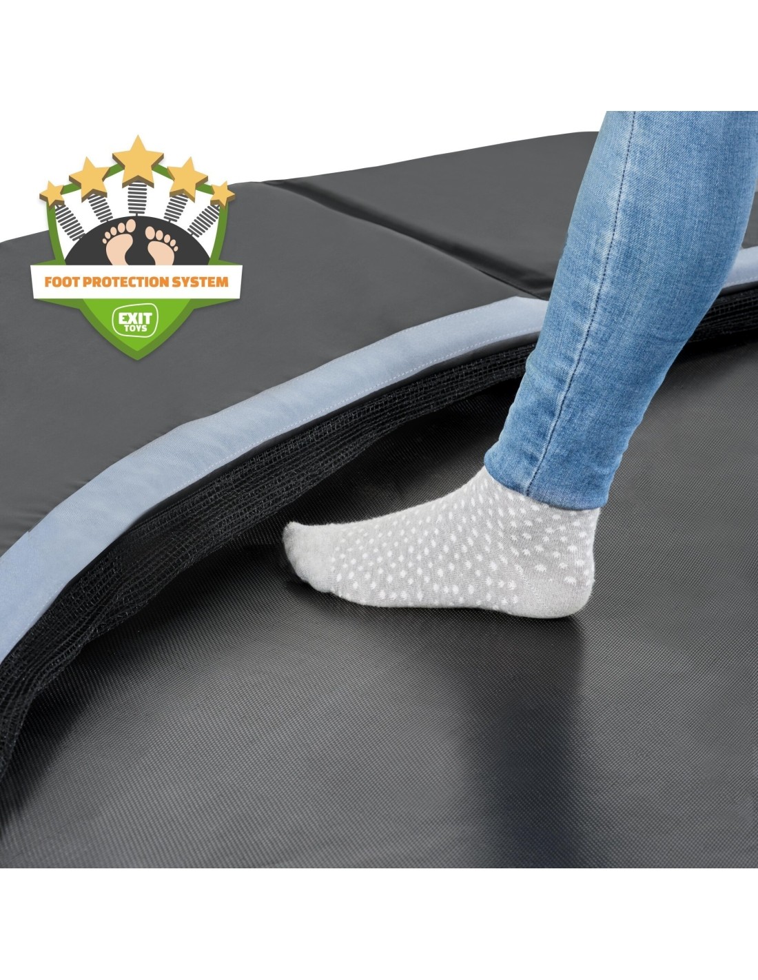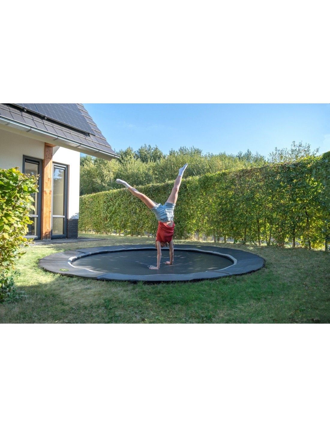 Trampolina sportowa naziemna EXIT Dynamic dla osób od 14 lat wzwyż to okrągła, matowo czarna trampolina naziemna bez siatki zabezpieczającej i płytek. Skoczkowie z dużym doświadczeniem bez problemu podniosą swoje umiejętności na wyższy poziom, ponieważ ta trampolina ma podwójne sprężyny stożkowe o długości 25 cm. A trampolina będzie też mocno trzymać się w miejscu nawet przy najwyższych skokach, ponieważ ultra stabilna górna szyna ma grubość 42 mm. Dodatkowo jest ona ocynkowana, a dla optymalnej ochrony przed wpływami atmosferycznymi i rdzą - malowana proszkowo. Luksusowy matowy wygląd z uzupełniającymi kolorowymi detalami nadaje jej stylowy i nowoczesny wygląd. Dodatkową zaletą trampoliny ziemnej jest to, że wyściółka znajduje się na tym samym poziomie co trawa, dzięki czemu trampolina jest w pełni zintegrowana z resztą ogrodu. Ta dynamiczna trampolina sportowa na poziomie gruntu jest dostarczana bez siatki bezpieczeństwa lub płytek. Oznacza to automatycznie, że nie podlega ona oznakowaniu CE i jest odpowiednia dla osób w wieku 14 lat i starszych. Oczywiście nasze trampoliny sportowe zostały przetestowane pod kątem wszystkich innych wymogów bezpieczeństwa, które dotyczą tych trampolin. Dla optymalnego poczucia bezpieczeństwa trampolina ta jest również dostępna z wysokiej jakości siatką bezpieczeństwa z zachodzącymi drzwiami lub z wyjątkowymi płytkami bezpieczeństwa EXIT Freezone.