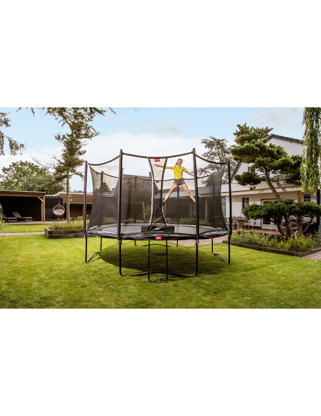 Skakanie na trampolinach to radosne doświadczenie, ale najważniejsze jest bezpieczeństwo. Z tego powodu BERG kładzie duży nacisk na testowanie swoich produktów. Wysokie i solidne siatki BERG gwarantują bezpieczne skakanie, nawet jeśli skacze się najwyżej, jak to możliwe. Wszystkie produkty BERG mają najwyższe międzynarodowe certyfikaty bezpieczeństwa. BERG przeprowadza niezależne testy TUV, Intertek i AiB Vincotte oraz testuje odporność materiałów na warunki pogodowe. Trampoliny są wyposażone w bardzo mocne maty do skakania (odporne na promieniowanie UV i przemakanie), umocowane na solidnych sprężynach. Krawędzie są idealnie dopasowane do maty, co zwiększa bezpieczeństwo i komfort skakania. Dzięki wzmocnieniu spawów ramy oraz zastosowaniu stalowych połączeń, konstrukcja jest jeszcze bardziej stabilna. Wszystkie metalowe elementy są ocynkowane wewnątrz i na zewnątrz, dzięki czemu nie rdzewieją.