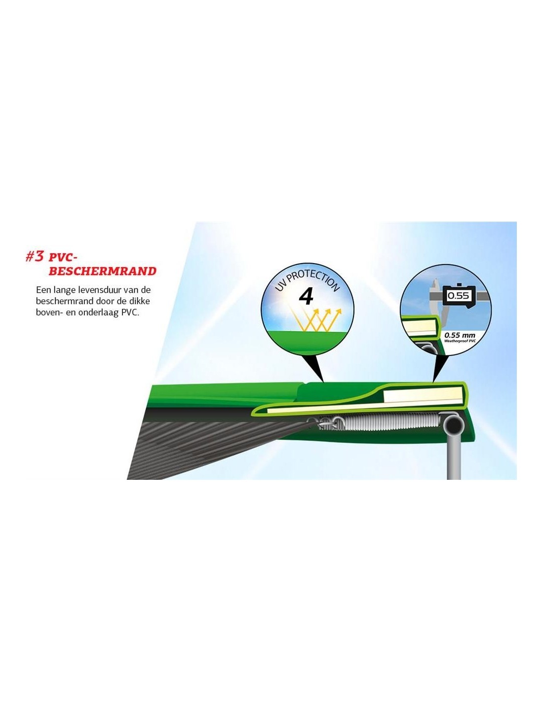 - Krawędź ochronna posiada górną i dolną warstwę z grubego PVC.