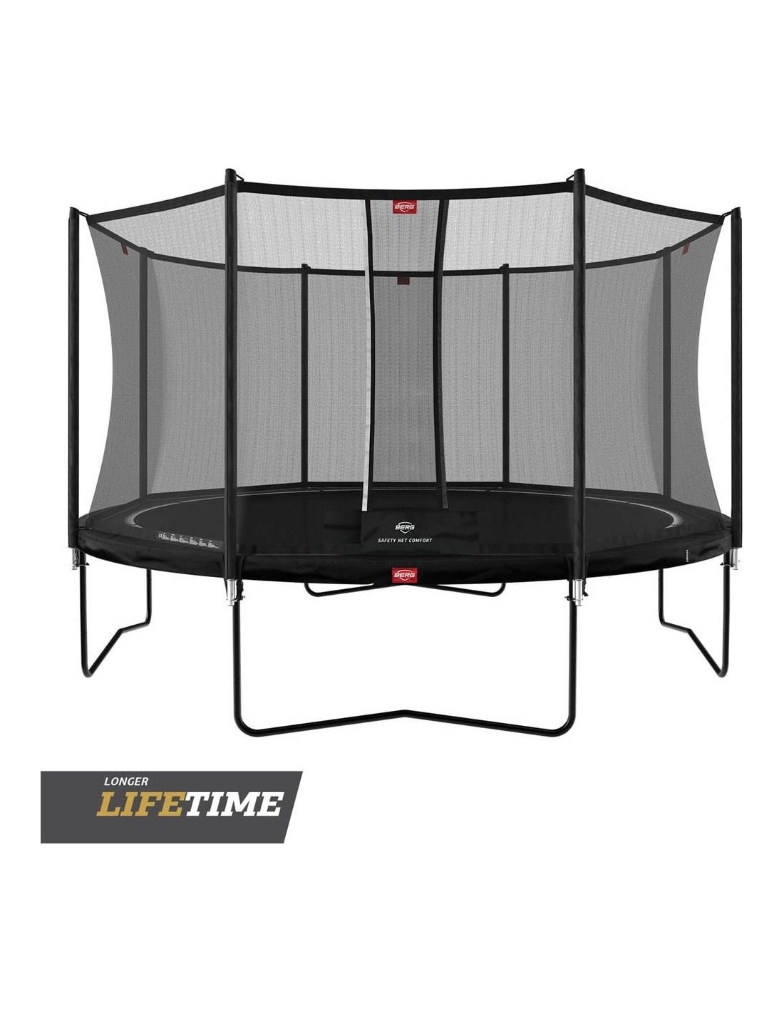 Skakanie na trampolinach to radosne doświadczenie, ale najważniejsze jest bezpieczeństwo. Z tego powodu BERG kładzie duży nacisk na testowanie swoich produktów. Wysokie i solidne siatki BERG gwarantują bezpieczne skakanie, nawet jeśli skacze się najwyżej, jak to możliwe. Wszystkie produkty BERG mają najwyższe międzynarodowe certyfikaty bezpieczeństwa. BERG przeprowadza niezależne testy TUV, Intertek i AiB Vincotte oraz testuje odporność materiałów na warunki pogodowe. Trampoliny są wyposażone w bardzo mocne maty do skakania (odporne na promieniowanie UV i przemakanie), umocowane na solidnych sprężynach. Krawędzie są idealnie dopasowane do maty, co zwiększa bezpieczeństwo i komfort skakania. Dzięki wzmocnieniu spawów ramy oraz zastosowaniu stalowych połączeń, konstrukcja jest jeszcze bardziej stabilna. Wszystkie metalowe elementy są ocynkowane wewnątrz i na zewnątrz, dzięki czemu nie rdzewieją.
