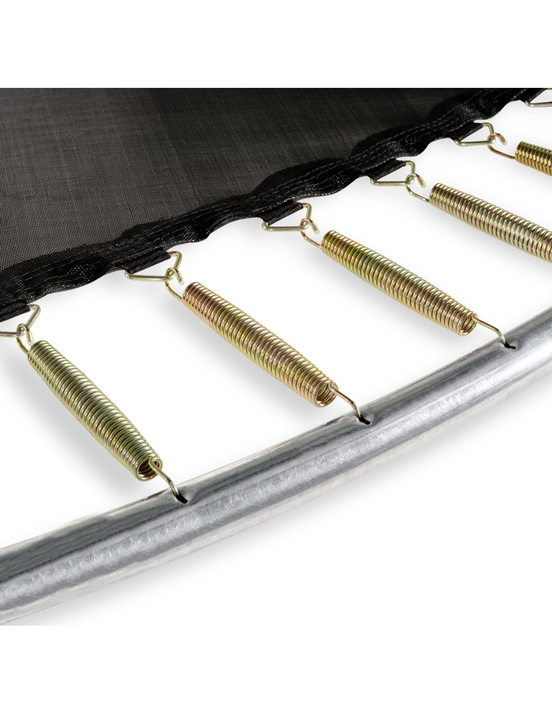 The EXIT Lotus Classic trampoline is a round trampoline with a padding and safety net. Thanks to its unique L-shaped legs, the EXIT Lotus Classic trampoline stands out from all other trampolines on legs, both in design and stability. The L-shaped legs make the Lotus frame extremely stable, thus reducing the risk of tipping over when high jumps are made. The EXIT Lotus Classic trampoline comes with a safety net with an overlapping flap. This child-friendly entrance closes automatically so that the safety net does not stay open unnoticed. The poles of the safety net are covered with foam. And like other EXIT trampolines, the Lotus Classic trampoline is equipped with the EXIT Foot Protection System (FPS). This net between the jump mat and padding prevents children's feet getting caught between the springs. The stylish appearance of the Lotus Classic trampoline goes further than the shape of the frame: a fibreglass ring keeps the safety net in shape so it's nice and taut. The trampoline has double conical springs, which ensure a smooth jump. In addition, the padding of this trampoline has a protective, water-repellent pvc top layer. The trampoline frame is galvanized and powder coated, so scratches and rust have no chance.
