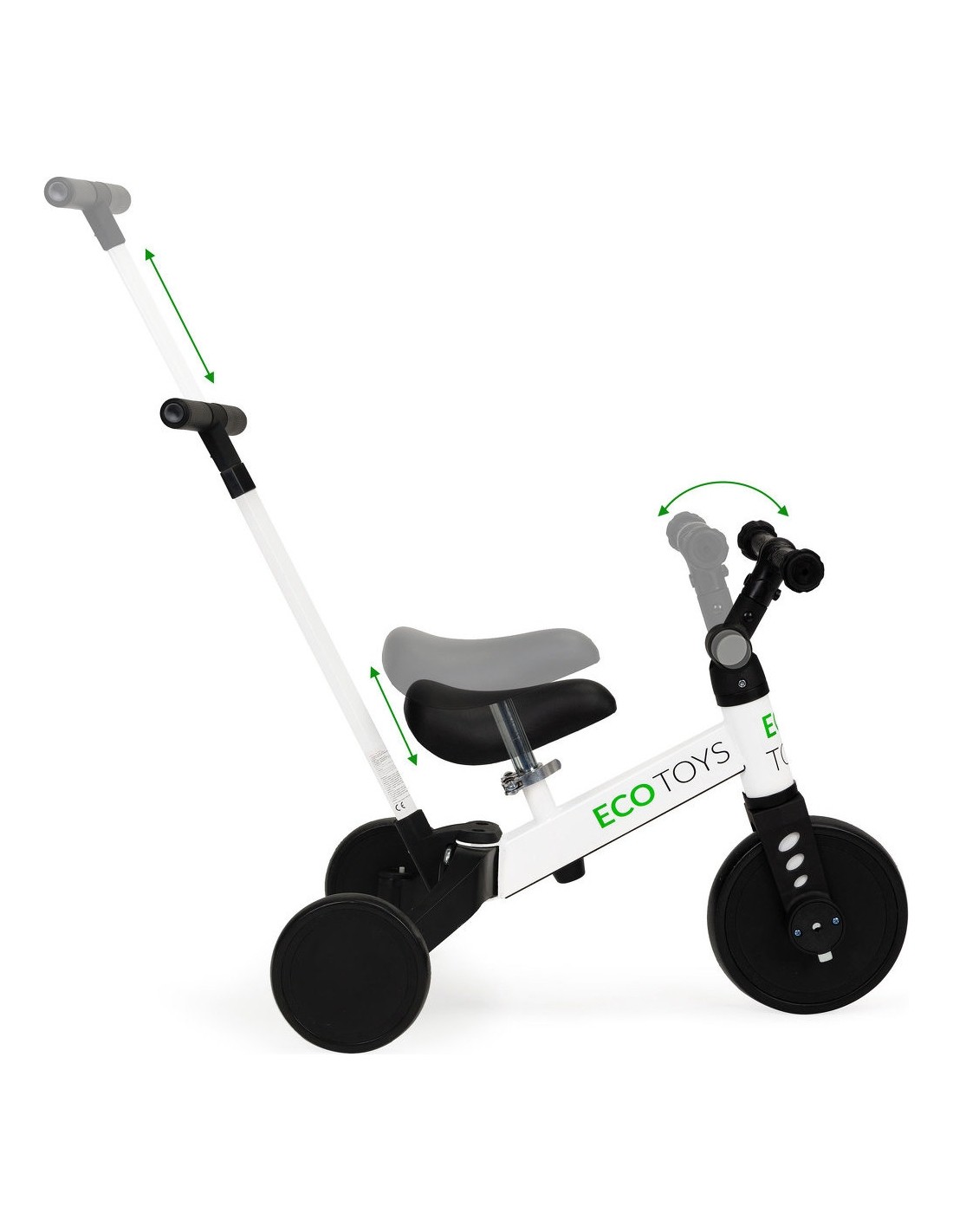 Dzięki przemyślanej konstrukcji możesz regulować wysokość siodełka ( 31-38 cm ), kąt nachylenia kierownicy oraz długość rączki do prowadzenia. Możliwość regulacji sprawia, że idealnie dopasujesz rowerek do wzrostu i możliwości dziecka.