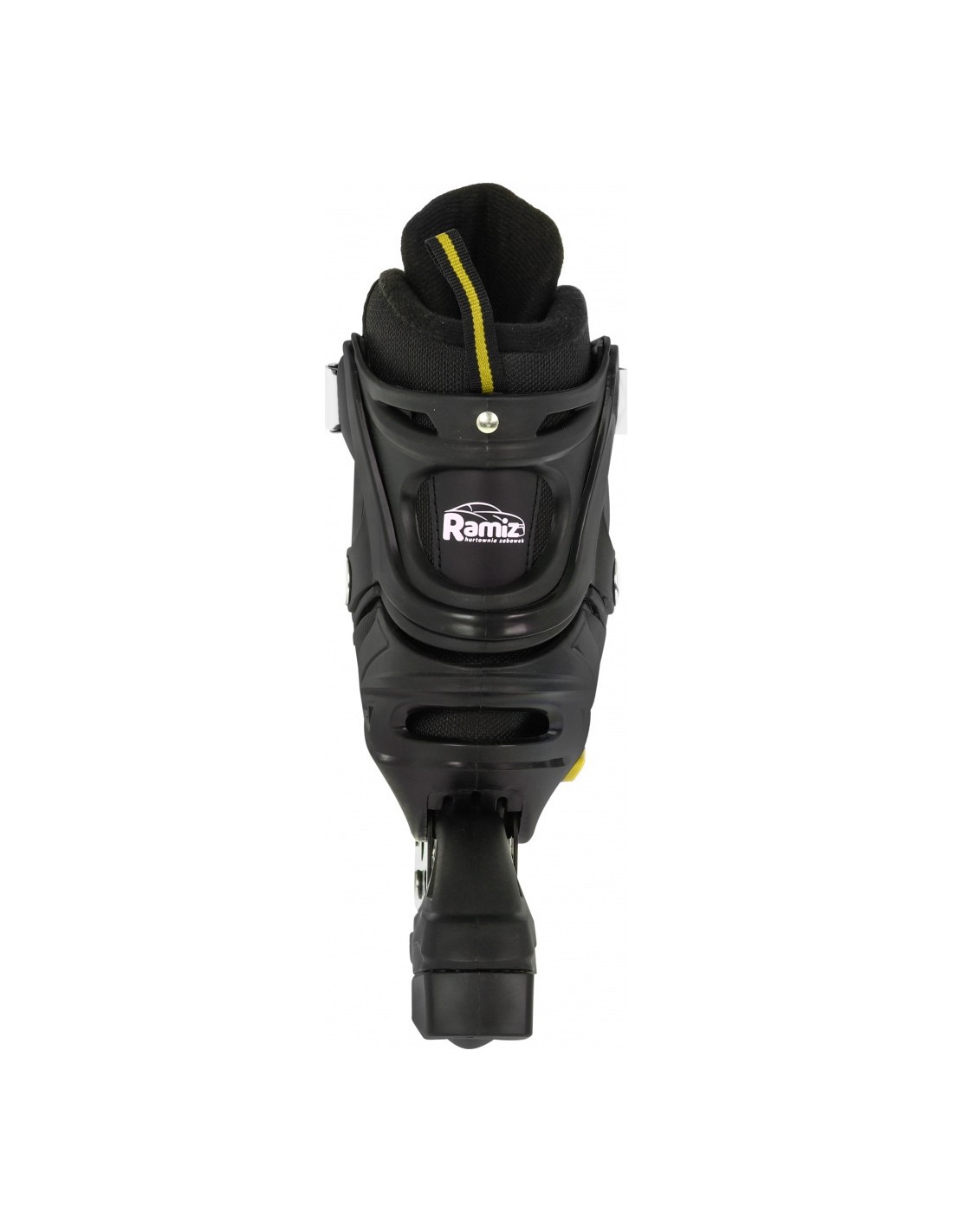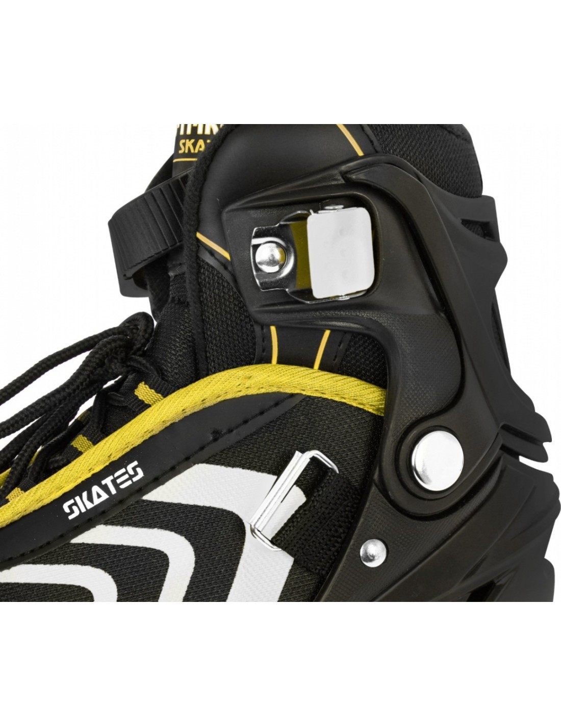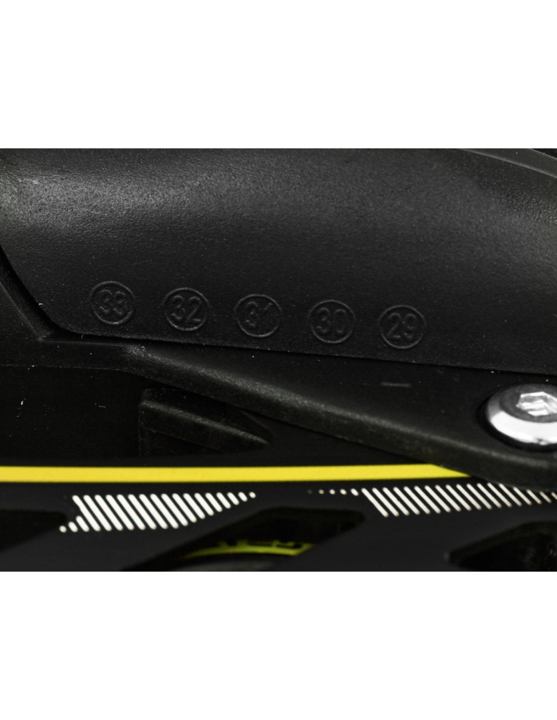 But posiada aż 5-stopniowy system regulacji rozmiaru. Za pomocą przycisku w szybki sposób można zmienić rozmiar buta. W tym modelu można zmienić rozmiar z nr 29 do 33. Wewnętrzna długość wkładki wynosi ok. 16,5-20 cm. Wewnętrzna wkładka buta wypełniona została pianką EVA, która dodatkowo pokryta została warstwą miękkiego materiału Velvet. Na tyle prawego buta umiejscowiony został intuicyjny hamulec.