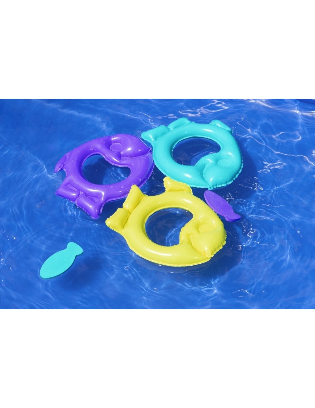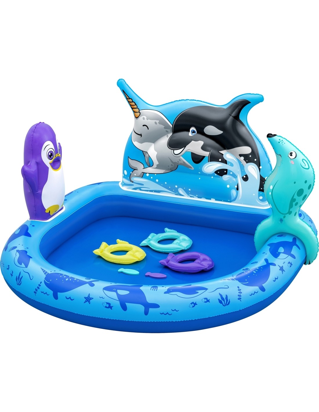Zestaw dmuchanych akcesoriów w wesołych kształtach wzbogaci zabawy maluchów. Foka, którą można zaczepić na brzegu, stanie się centrum zabawy, gdy dzieci będą wrzucać na nią dmuchane obręcze. Natomiast dmuchany pingwin z piankowymi rybkami do karmienia, doda interaktywnego elementu, rozwijając wyobraźnię i zdolności manualne dzieci. Design placu zabaw ozdobiony jest uroczymi nadrukami morskich zwierząt, co spodoba się każdemu dziecku.
