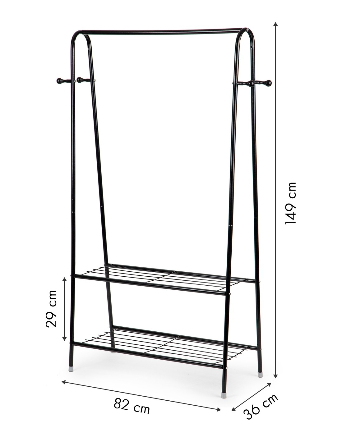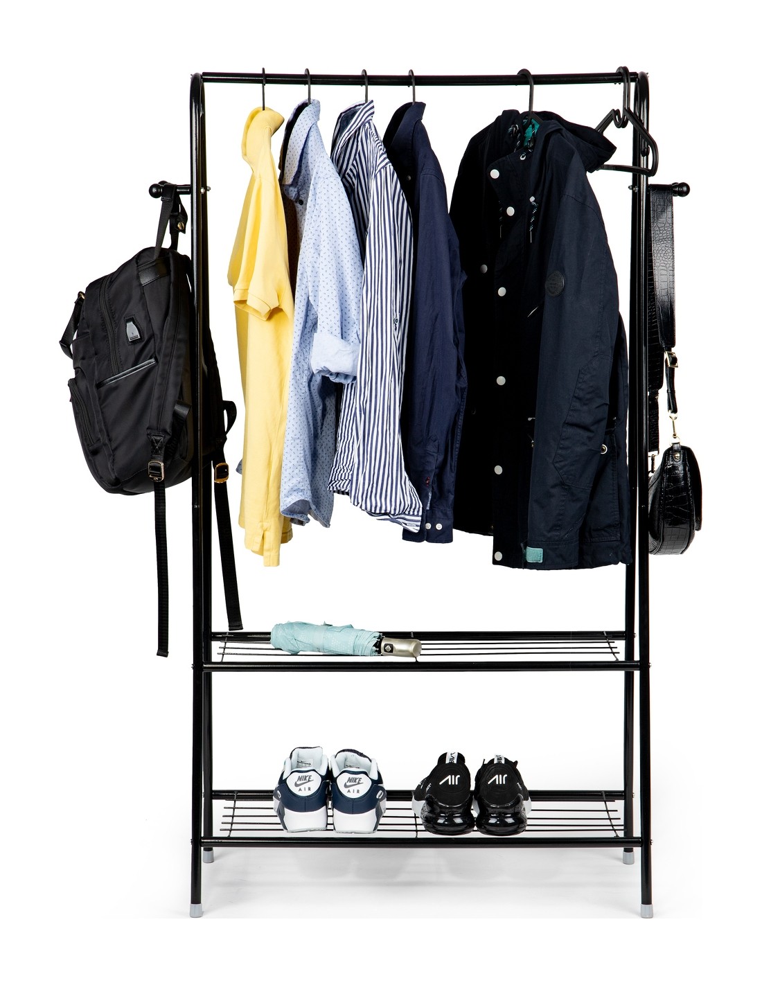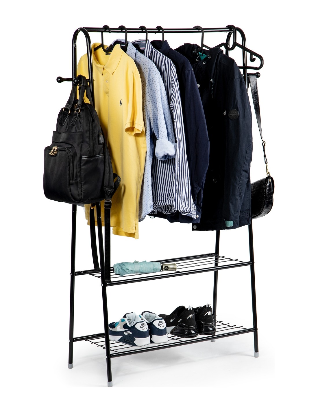 FUNKCJONALNOŚĆGórny poprzeczny drążek ( 77 cm. ) pomieści kurki i koszule a boczne haczyki idealnie nadają się do odwieszenia torebek, plecaków, czy też szali i czapek. Stojak w dolnej części posiada dwie funkcjonalne półki, na których można odłożyć mniejsze elementy garderoby, torebki a nawet buty. Metalowa konstrukcja oparta na 4 nogach gwarantuje stabilność nawet przy dużym obciążeniu. |