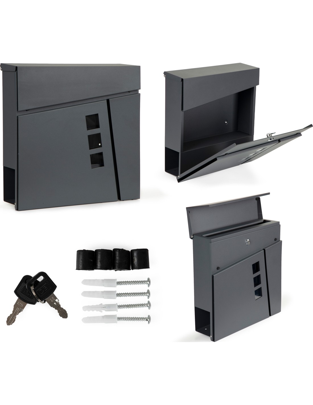 Razem ze skrzynką otrzymasz zestaw montażowy - 4 kołki i dystanse, dzięki temu możesz przystąpić do założenia skrzynki zaraz po rozpakowaniu. W zestawie znajdują się dwa klucze do otwierania skrzynki.