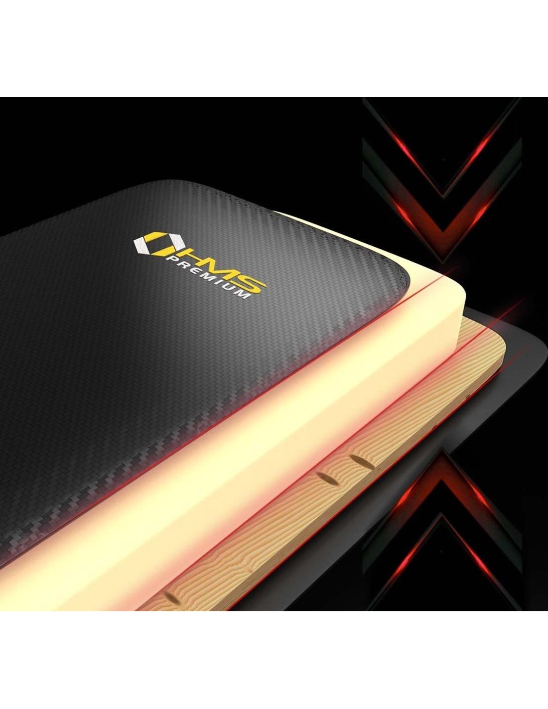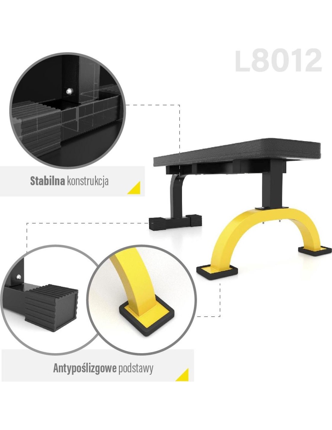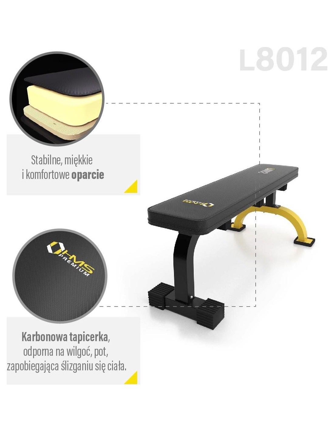 L8012 HMS PREMIUM, to ławka wolnostojąca, przeznaczona do ćwiczeń z hantlami i sztangą. Idealnie sprawdzi się również, w połączeniu ze stojakiem lub suwnicą Smitha. Stabilna solidna konstrukcja Solidna konstrukcja, gwarantuje bezpieczeństwo i wygodę oraz pozwala osiągnąć maksymalne obciążenie 200 kg. Pomimo swojej mocnej konstrukcji, ławka jest lekka, dlatego bardzo łatwo manewrować jej położeniem. Model L8012, to ławka pozioma która nie posiada możliwości regulacji kąta nachylenia oparcia. Przekłada się to na maksymalną stabilność. Komfort i wygoda Solidna deska zapewnia stabilność oparcia, a miękka gąbka gwarantuje komfort i wygodę podczas ćwiczeń. Grubość gąbki jest bardzo istotna, ponieważ to ona ma bezpośredni wpływ na idealne ułożenie ciała. Nowoczesna karbonowa tapicerka, jest odporna na wilgoć i pot oraz zapobiega ślizganiu się ciała podczas ćwiczeń. Jest również bardzo przyjemna w dotyku. Stylowy design Ławka jest nie tylko wygodna i funkcjonalna, ale także stylowa. Połączenie czarnego karbonowego materiału z żółtymi haftowanymi elementami, daje świetny efekt wizualny, który jest charakterystyczny dla marki HMS PREMIUM. Imponująca jakość wykonania i estetyka ławki L8012 HMS PREMIUM, sprawiają, że jest to idealny sprzęt do domowej siłowni.