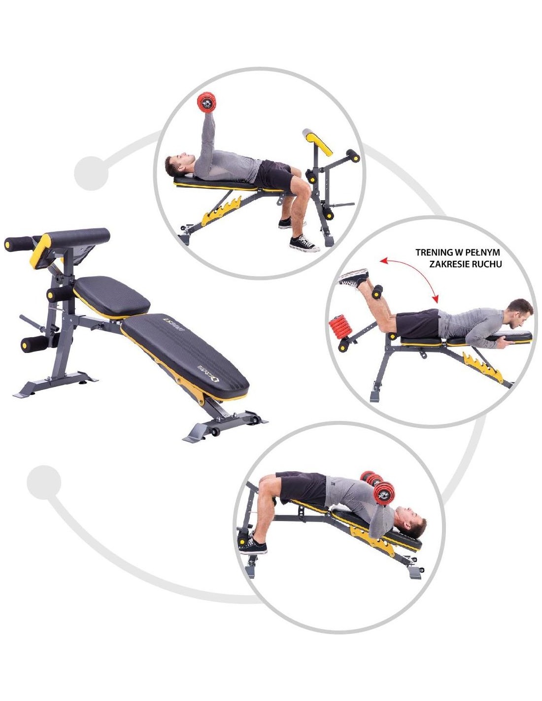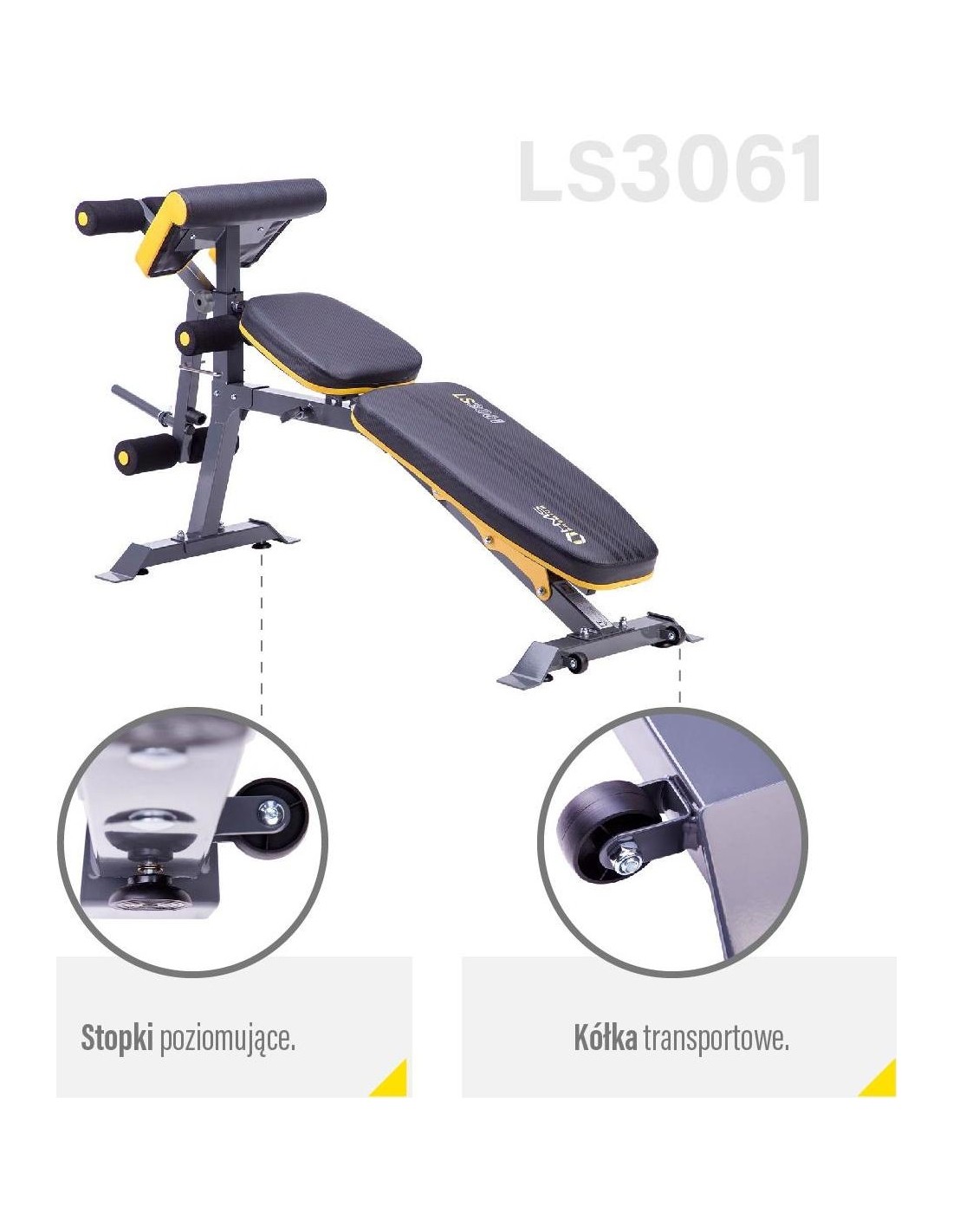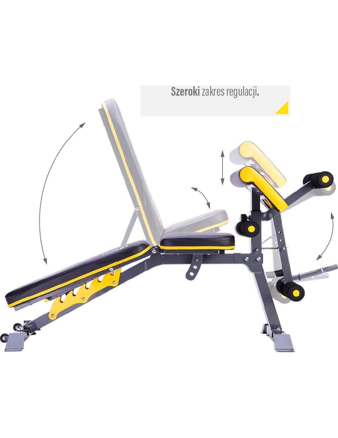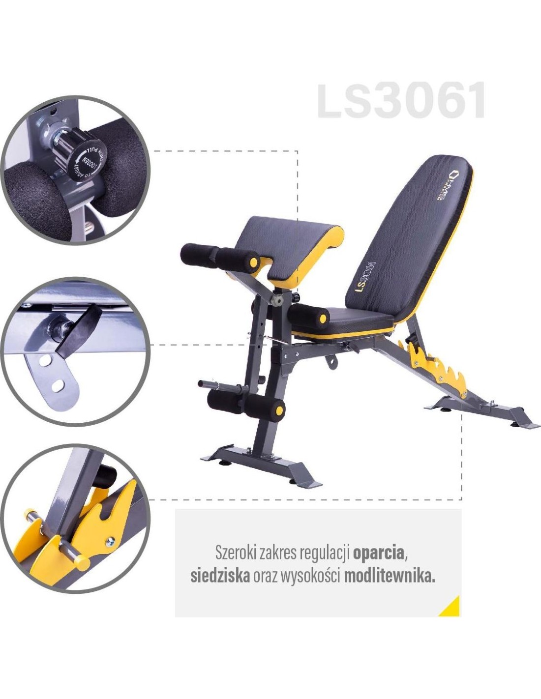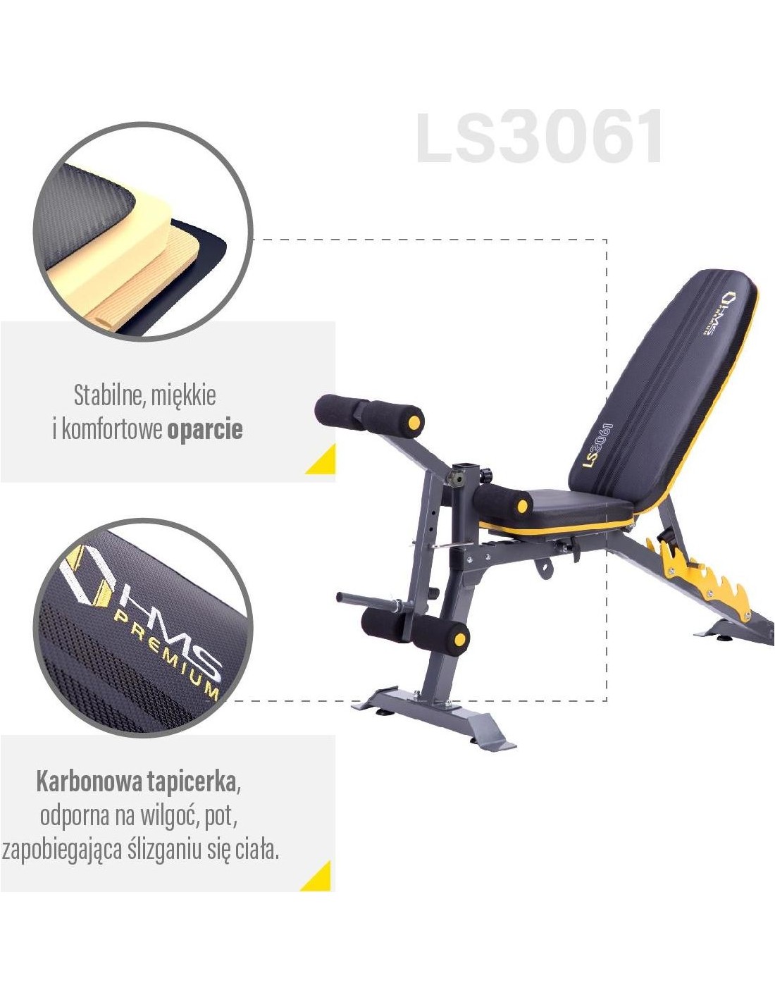 LS3061 HMS PREMIUM, to ławka z modlitewnikiem przeznaczona do treningu ze sztangą lub hantlami. Ławeczka 4 w 1 Ławeczka daje mnóstwo możliwości ćwiczeniowych. Jej budowa sprawia, że idealnie sprawdzi się ze stojakiem na sztangę, jak również do treningu z hantlami. Zakres regulacji kąta nachylenia oparcia, pozwoli w pełni rozwinąć ćwiczony mięsień. Możliwe jest wykonanie ćwiczeń na klatkę piersiową oraz barki. Ustawienie ławeczki skośnie w dół, pozwoli wykonać skłony czyli tzw. brzuszki. Uchwyt na nogi zagwarantuje wygodę i bezpieczeństwo podczas wykonywania tego ćwiczenia, angażującego mięśnie brzucha. Nie zapominajmy, że ławka posiada modlitewnik, powiększa to wachlarz możliwości ćwiczeniowych, o trening bicepsów. Wymontowując modlitewnik, zyskujemy możliwość wykonania treningu nóg. Na prasie do nóg możemy wykonać ćwiczenia mięśni czworogłowych uda. Ustawiając ławkę w pozycji poziomej, kładąc się na brzuchu i zahaczając stopy o uchwyt, wykonany uginanie nóg z obciążeniem, angażując tym samym mięsnie dwugłowe uda. Komfort i wygoda Solidna deska zapewnia stabilność oparcia, a miękka gąbka gwarantuje komfort i wygodę podczas ćwiczeń. Grubość gąbki jest bardzo istotna, ponieważ to ona ma bezpośredni wpływ na idealne ułożenie ciała. Nowoczesna karbonowa tapicerka, jest odporna na wilgoć i pot oraz zapobiega ślizganiu się ciała podczas ćwiczeń. Jest również bardzo przyjemna w dotyku. Wiele możliwości regulacji Ławka posiada szeroki zakres regulacji oparcia, siedziska oraz wysokości modlitewnika. Tak obszerne możliwości manewrowania ustawieniem ławki pozwolą swobodnie dopasować ją do wzrostu użytkownika oraz do konkretnego ćwiczenia. Stylowy design Ławka jest nie tylko wygodna i funkcjonalna, ale także stylowa. Połączenie czarnego karbonowego materiału z żółtymi haftowanymi elementami, daje świetny efekt wizualny, który jest charakterystyczny dla marki HMS PREMIUM. Model LS3061 HMS PREMIUM, to obowiązkowa pozycja na liście wyposażenia domowej siłowni.