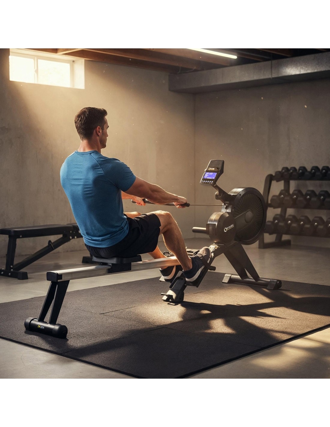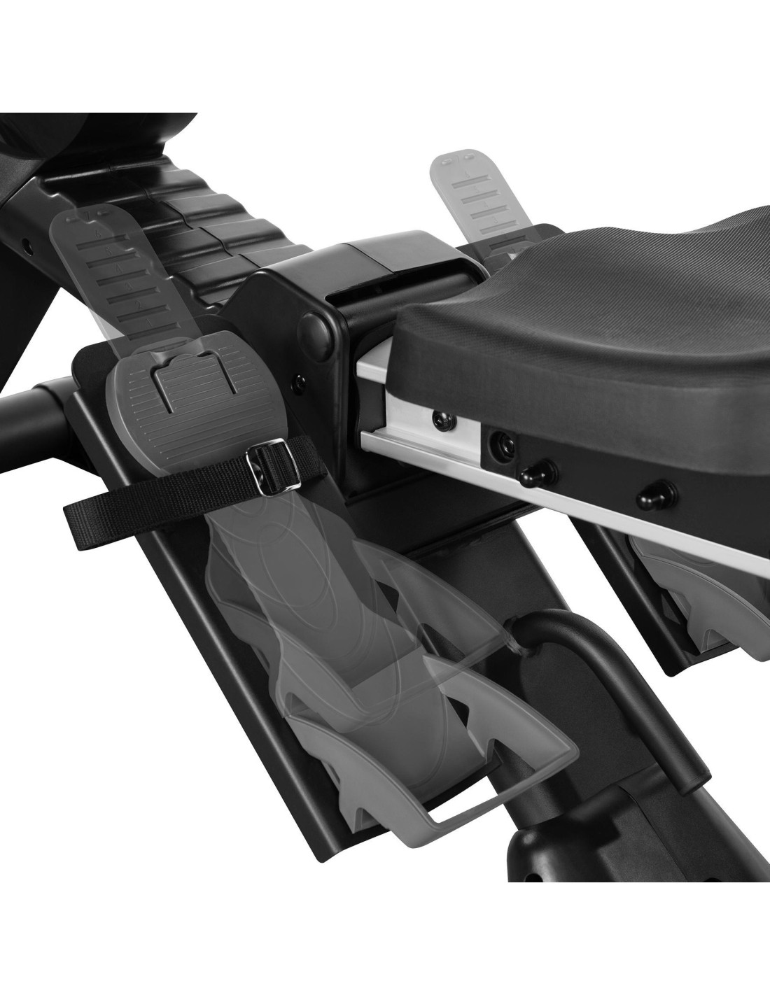 The rowing trainer features a clear LCD display showing key workout parameters in real time: