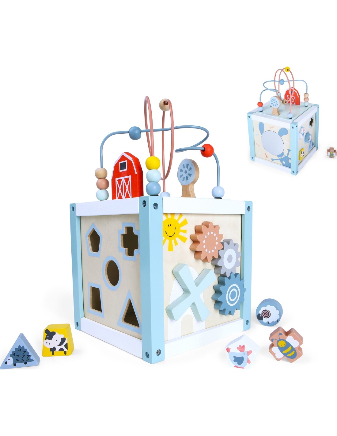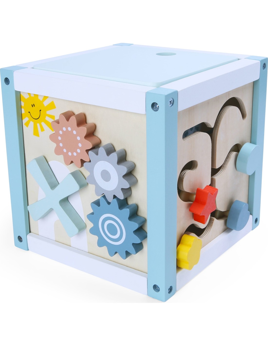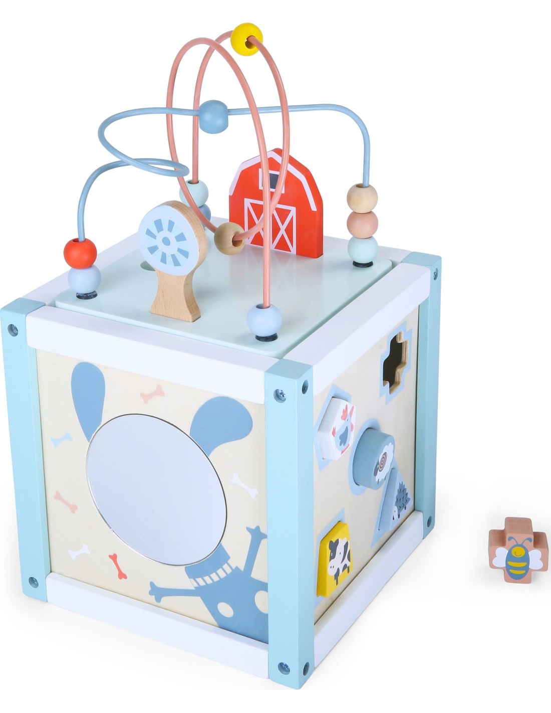 - Na bokach ścianki maluch może bawić się sorterem dopasowując odpowiedni kształt klocków. Kolejne ściany kostki posiadają lusterko, labirynt oraz obrotowe koła zębate.