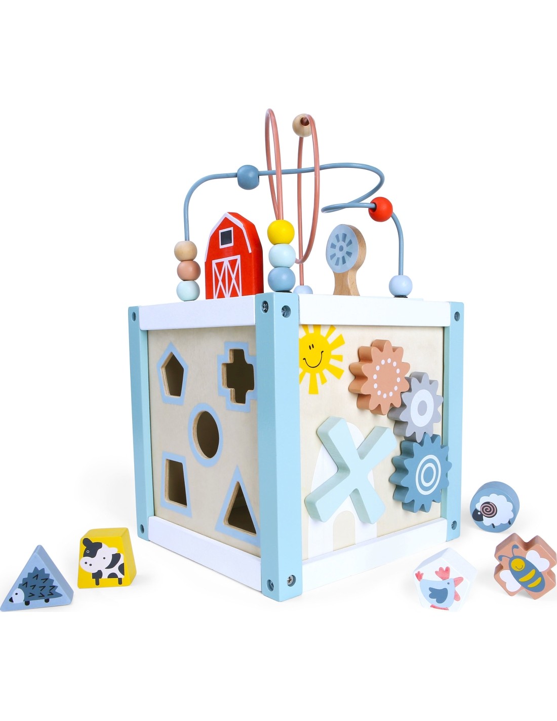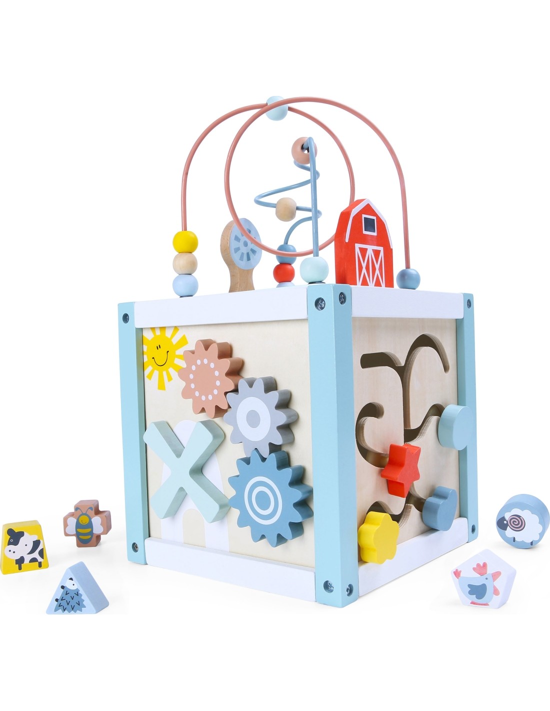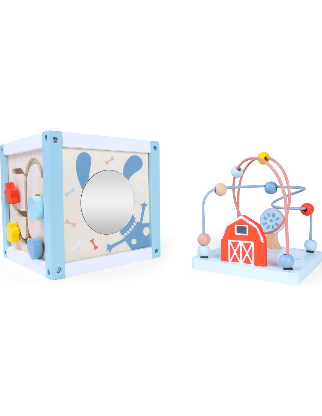 - Na bokach ścianki maluch może bawić się sorterem dopasowując odpowiedni kształt klocków. Kolejne ściany kostki posiadają lusterko, labirynt oraz obrotowe koła zębate.